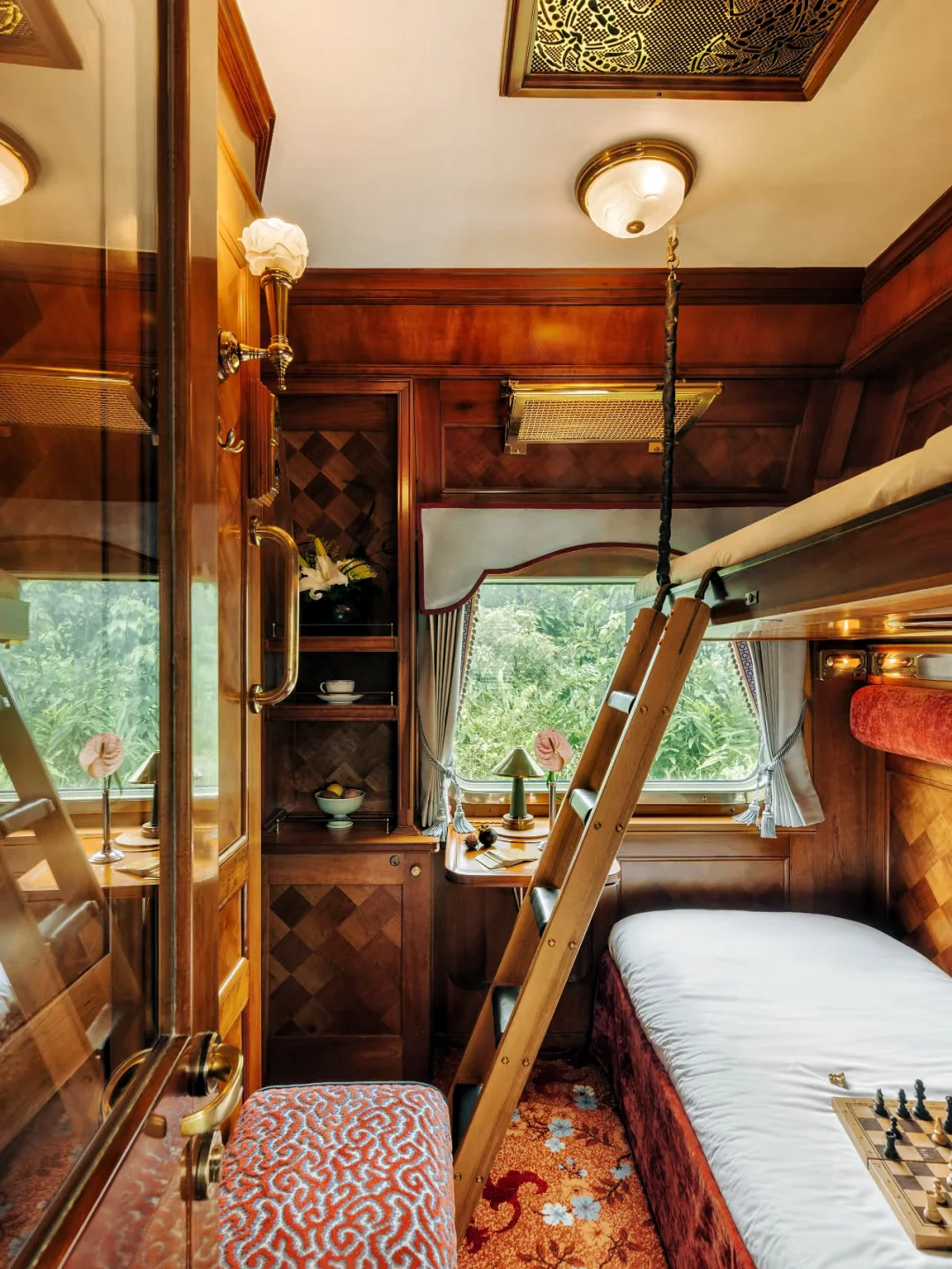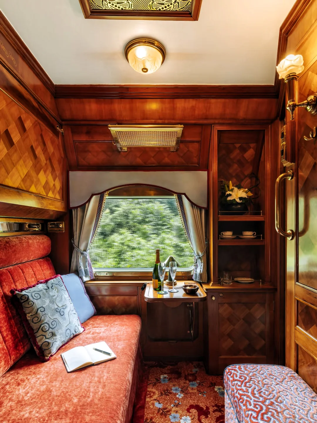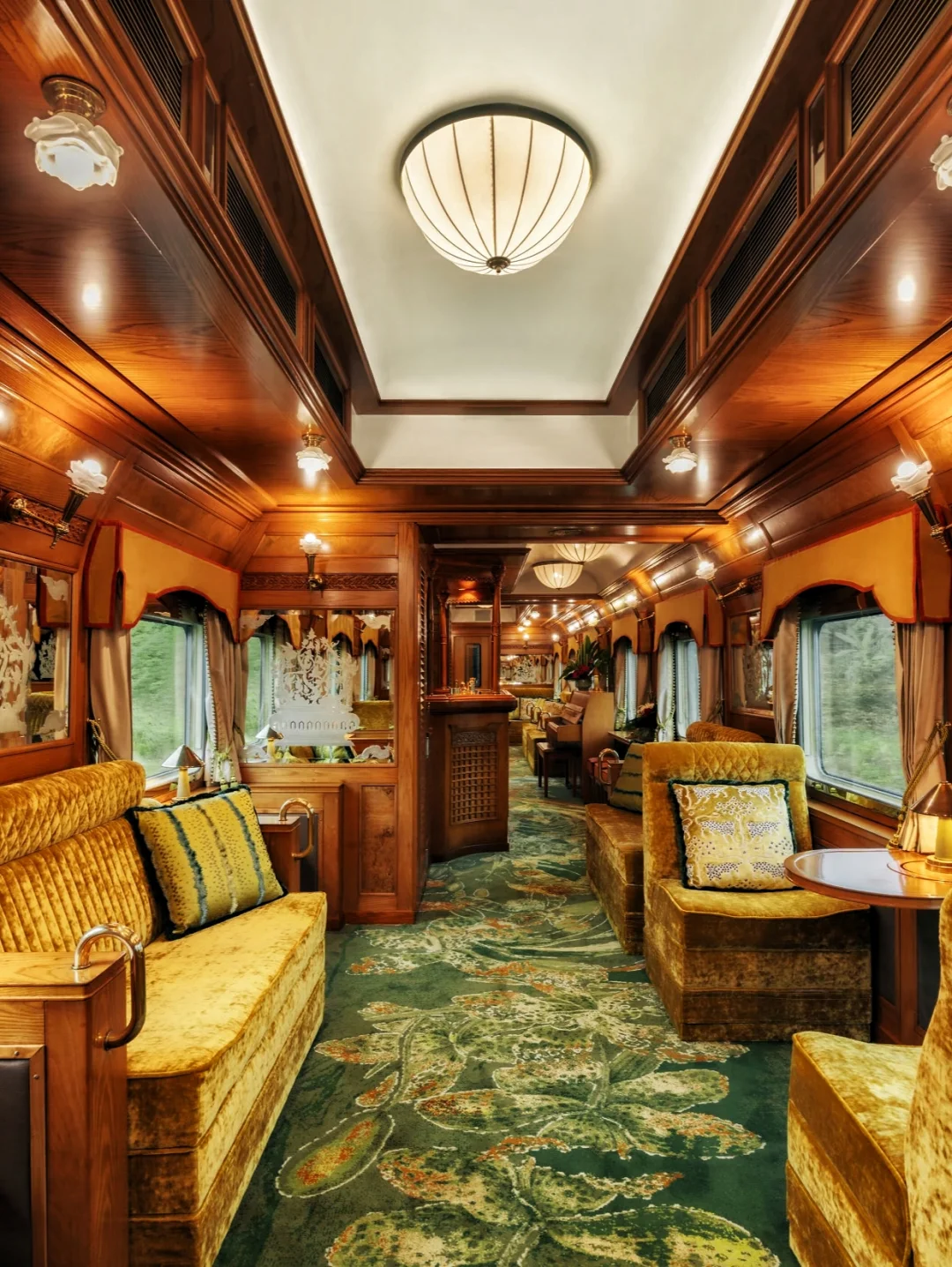 复古车厢,黄铜装饰、木质镶板、丝绒座椅