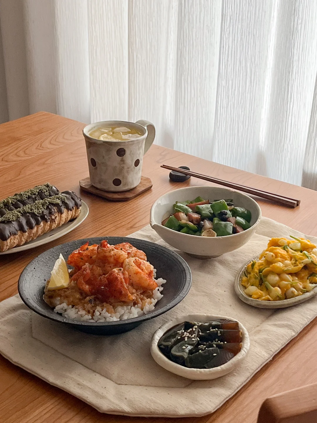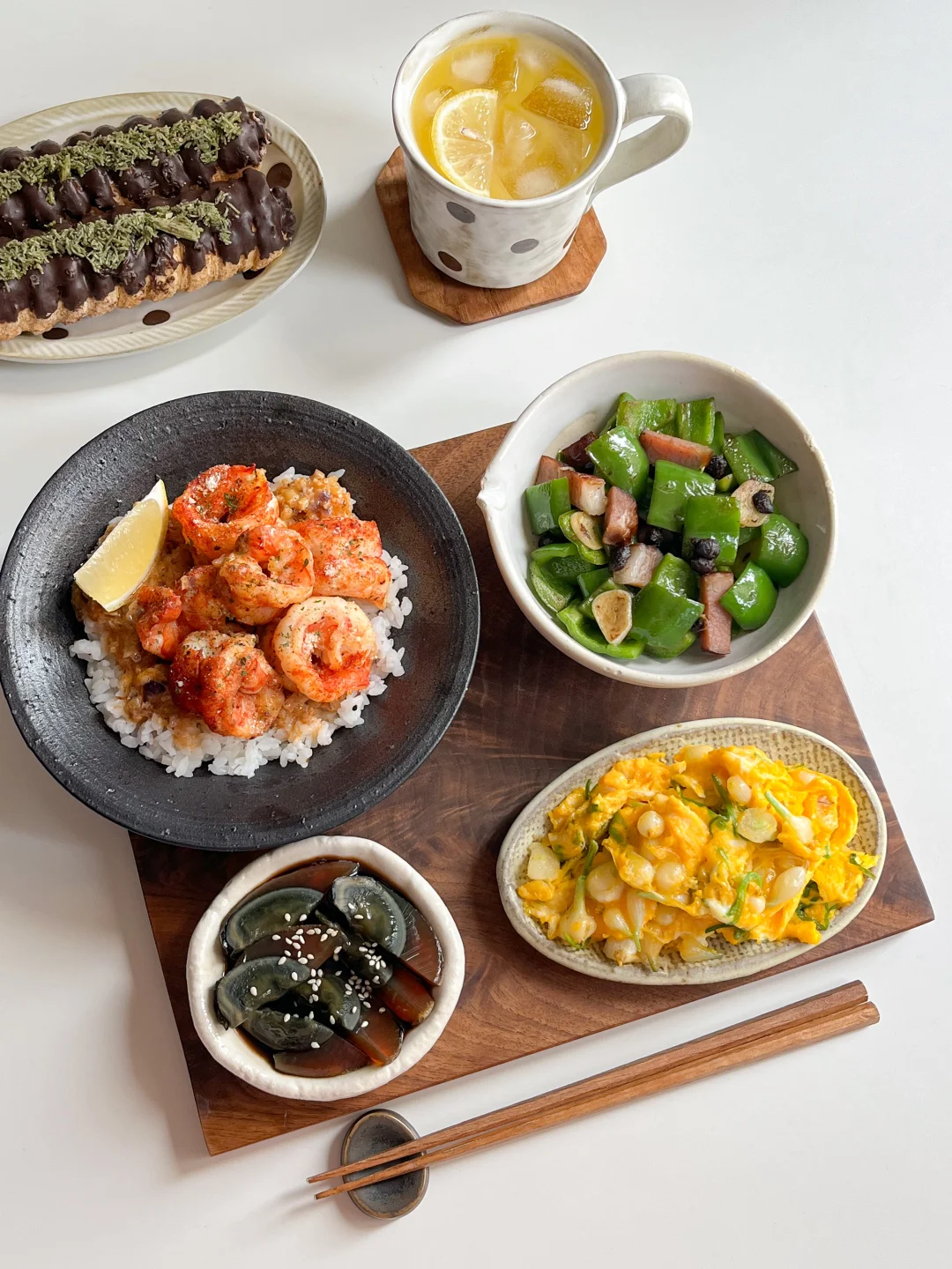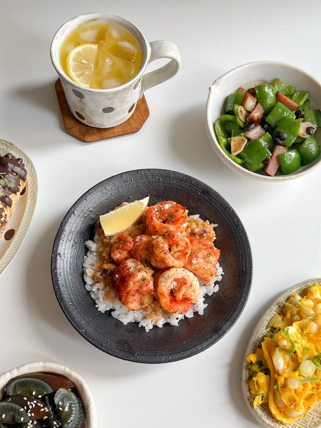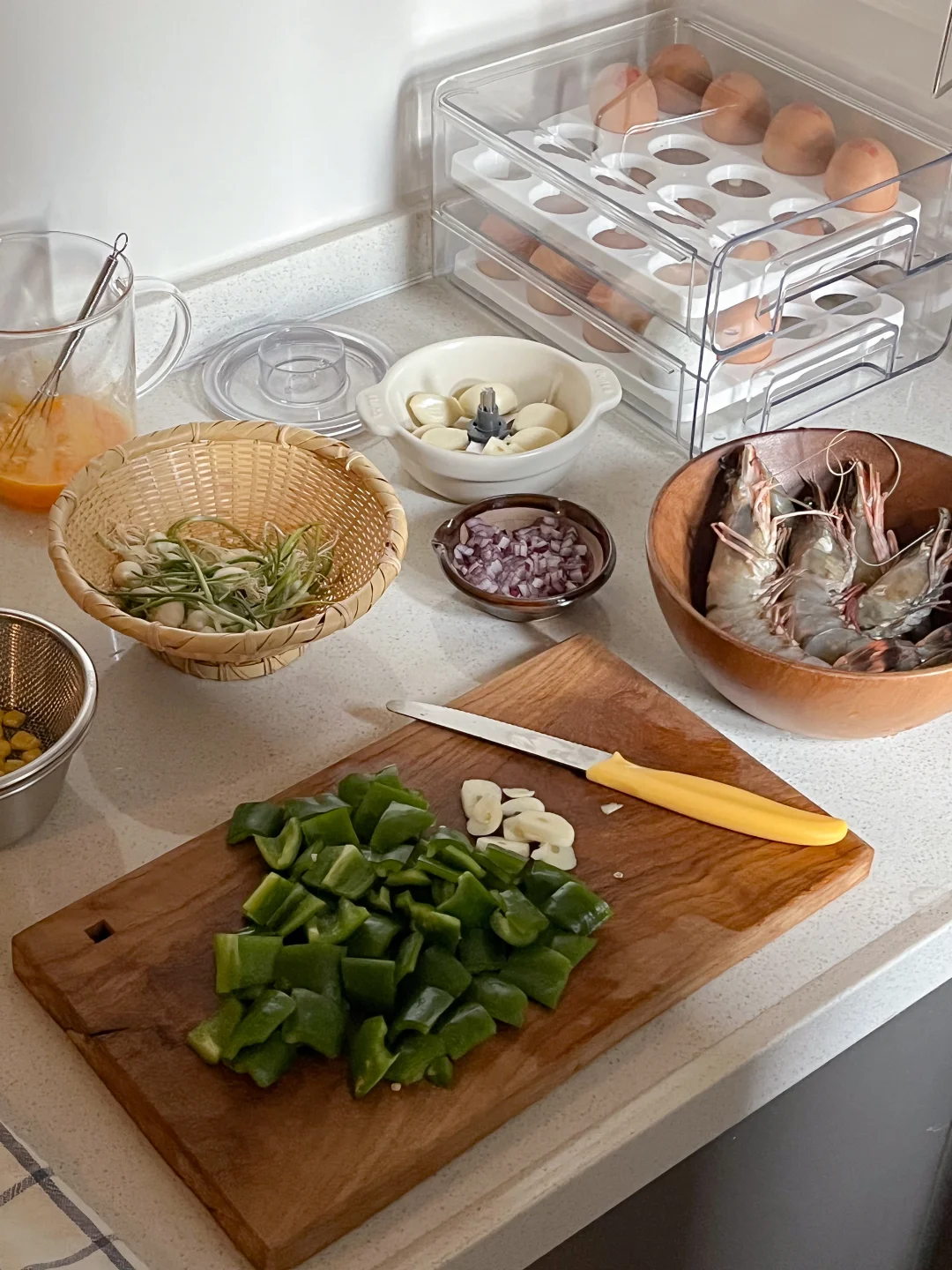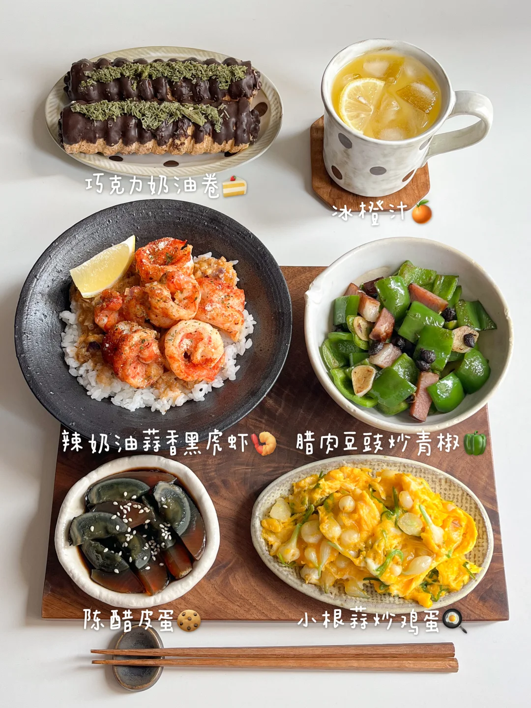 今天的饭: 辣奶油蒜香黑虎虾🍤 腊肉豆豉炒青椒🫑 小根蒜炒鸡蛋🍳 陈醋皮蛋🍪 巧克力奶油卷🍰 春天专属的野菜有好多 我不爱苦苦的 就很喜欢小根蒜 清脆还带有一丢丢很淡的蒜香🧄 在家做成咸菜或者简单的炒个蛋 一口下去就是春天的味道~ 不管自己摘的还是买的 处理它都很麻烦 回家用清水先给浸泡半个小时 外面的皮变得软了就好剥掉啦[赞R]