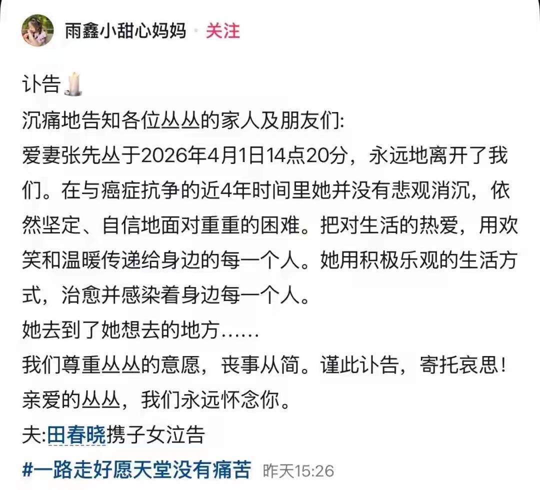 大连40岁“雷特妈妈”张先丛抗癌四年后离世:她用笑声陪女儿到最后,却没能等到奇迹的春天 当“雨鑫小甜心妈妈”的账号定格在最后一则讣告,无数人的心被狠狠揪紧。辽宁大连的张先丛,在2026年4月1日那个平静的午后,永远停下了她奔波的脚步。四十岁的人生,她扛起了女儿罕见的疾病,又迎面撞上晚期癌症的暴击。 她的故事始于一场平凡的幸福。2011年结婚,2013年女儿雨鑫诞生,日子本该沿着温馨的轨迹滑行。可命运偏偏爱开玩笑,女儿两岁时被确诊雷特综合征,一种会逐渐夺走语言和行动能力的罕见病。从此,这位母亲的生活里没有了“轻松”二字。 她把自己炼成了康复师,每天为女儿按摩训练,把绝望揉碎在日复一日的坚持里。2021年,她带着女儿登上央视,镜头前那份苦涩中的坚韧,让无数人湿了眼眶。人们称她为“雷特妈妈”,仿佛“母亲”二字前加上疾病的名称,就能概括她全部人生。 然而命运的刁难并未停止。2022年,卵巢癌晚期的诊断书又递到她手中。一边是亟待照顾的女儿,一边是自己急速流逝的生命,这道选择题残酷得没有答案。可她偏偏选了最艰难的那条路——两者都扛。 她在社交平台上记录抗癌日常,分享与女儿的温暖瞬间。视频里的她常常笑着,那笑容不像伪装,更像是一种淬炼过的生命态度。她鼓励着同病相怜的病友,安慰着其他特殊家庭,仿佛自己不是那个最需要被安慰的人。 今年二月,账号更新戛然而止。关心她的人们默默祈祷,却终究没等来奇迹。她曾说过,最大的执念就是陪女儿走过每一季,看着孩子长大。如今春天又至,她却永远留在了这个清明前夕。 翻看她的视频,你会发现一种惊人的生命力。那不是不知痛苦的盲目乐观,而是在认清生活全部真相后,依然选择热爱与输出的勇气。她治愈了别人,却没能救赎自己。这种反差,恰恰戳中了时代最深的痛点。 我们哀悼一位伟大母亲的离去,更在思考她背后代表的群体。那些在罕见病与重病双重重压下,依然努力发光的中年人,他们的坚韧与脆弱,需要被看见、被支撑。张先丛走了,但雨鑫的人生还要继续,还有无数个“张先丛”正在跋涉。 她最终去到了“想去的地方”。那里或许没有病痛,只有她一直渴望的、陪女儿长大的漫长时光。而留在人间的这份爱与坚韧,会像种子一样,在无数人心里生根发芽。告别不是终点,被记住的勇气会继续流淌。 (来源:@雨鑫小甜心妈妈、青岛新闻网、抖音平台相关报道及网友评论综合整理) 雷特综合征 抗癌母亲