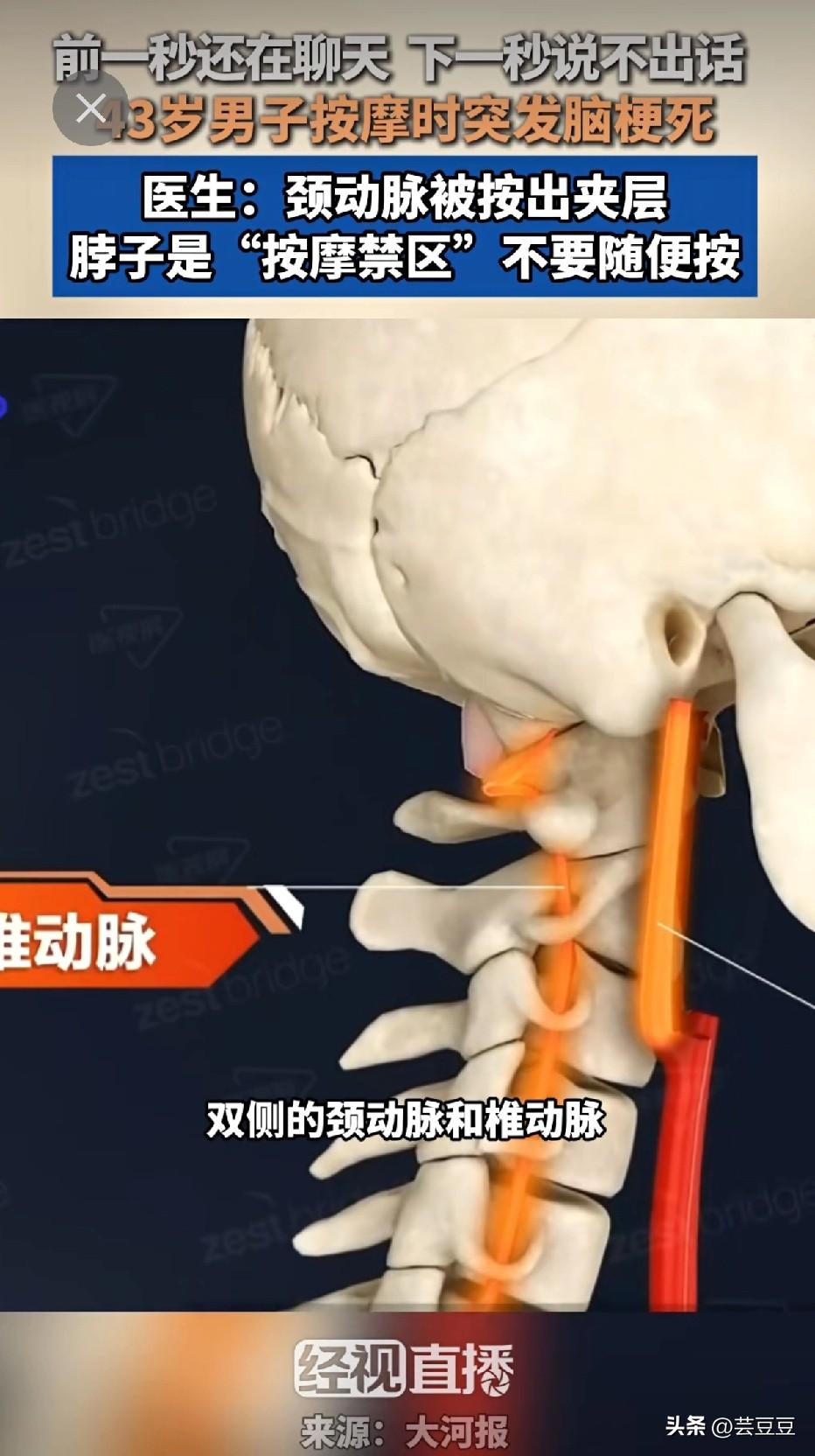 太吓人了! 43岁男子,前一秒还和按摩师正常聊天,状态好好的,下一秒突然说不出话,身体瞬间出现异常,紧急送医后,被确诊为急性脑梗死! 好好的人怎么会突然脑梗?医生检查后给出的原因,让所有人后背发凉:颈动脉被按出了夹层!正是按摩时不当的手法,损伤了颈部脆弱的血管,导致血管内膜撕裂,形成血栓堵塞脑部,才引发了致命的脑梗。 很多人觉得脖子酸、肩膀累,去按摩店按一按就舒服了,甚至特意让按摩师用力掰脖子、大力揉捏颈部,殊不知,脖子就是人体的“按摩禁区”! 我们的颈部布满了重要的血管、神经,颈动脉更是脑部供血的关键通道,它管壁薄、位置浅,稍微用力不当、手法过猛,就极易造成血管夹层、撕裂,轻则头晕恶心,重则直接引发脑梗、瘫痪,甚至危及生命! 尤其是中老年人,本身可能存在血管硬化、斑块等问题,盲目按摩脖子,无异于拿生命开玩笑!日常颈部不适,千万别随便去非专业机构按摩,更不要让人随意掰动、大力揉捏颈部,一定要选择正规医院,找专业医生处理。 转发提醒身边人!别让放松变成灾难,脖子再酸也别乱按,保命常识一定要记牢!