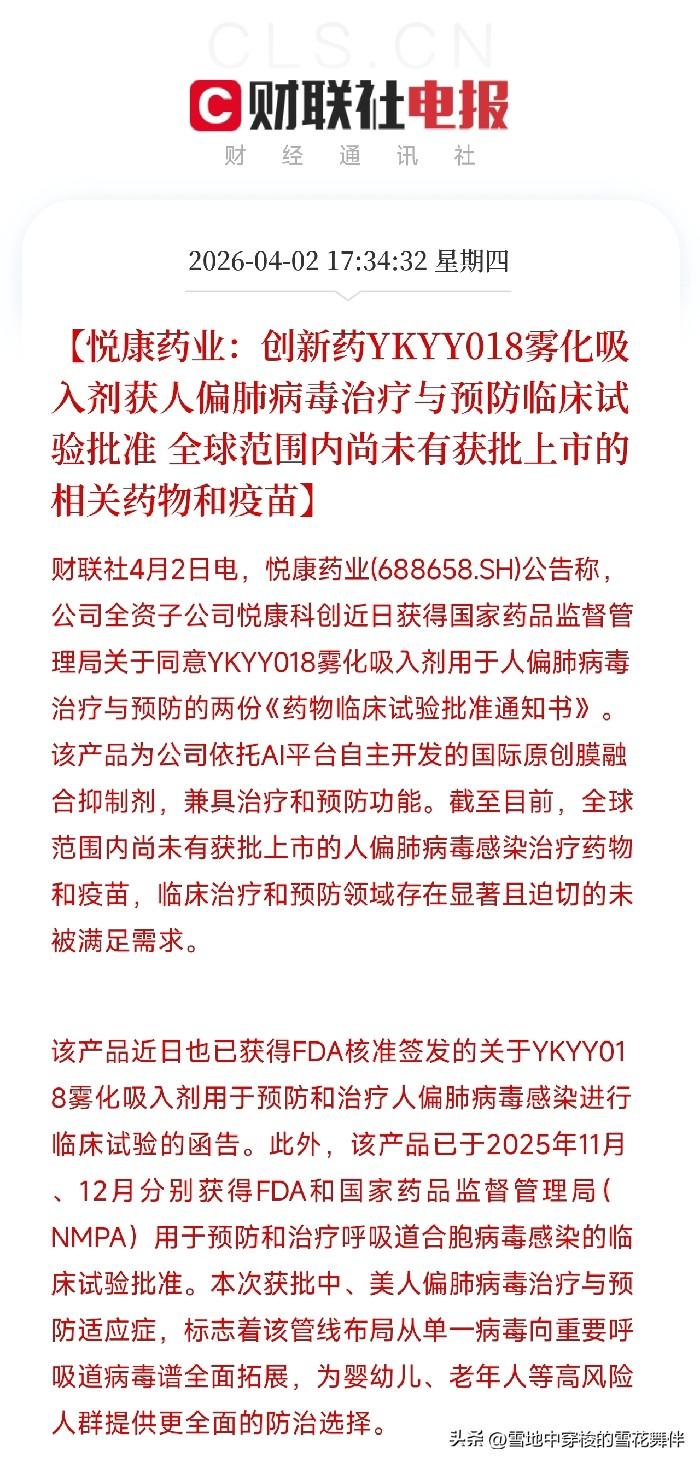 创新药又争了口气,悦康药业拿下全球首款人偏肺病毒药物临床批件 刚刷到一条消息,悦康药业公告说,公司自主研发的YKYY018雾化吸入剂,获得了国家药监局的人偏肺病毒治疗与预防临床试验批准。与此同时,美国FDA也核准了这款产品的临床试验。 全球范围内,还没有获批上市的人偏肺病毒感染治疗药物和疫苗。悦康这个,是第一个。治疗和预防双功能,雾化吸入,对婴幼儿、老年人这些高风险人群特别友好。 人偏肺病毒,很多人没听过。它和呼吸道合胞病毒(RSV)是兄弟,每年冬春季节高发,小孩、老人感染后容易发展成重症肺炎。以前没药,只能硬扛。现在终于有药在路上了。 悦康这次获批,有两个看点。一是AI平台开发的。公司说依托AI平台自主开发,说明AI制药不是概念,真能出成果。二是中、美同时获批。FDA能批,说明数据过硬,不是国内自嗨。 创新药这个赛道,A股一直有个毛病:讲故事的多,出产品的少。悦康这次虽然不是商业化,但临床批件是实打实的。如果后续临床数据好,这款药就是几十亿甚至上百亿的大品种。 今天A股医药板块本来就在涨,津药药业5连板,双鹭药业7天4板。悦康这条消息,明天大概率有反应。但别上头,创新药从临床到上市,路还很长。 投资这事,说到底是投未来。创新药是长线赛道,不是短线炒作。想赚快钱的,别来;愿意蹲的,可以看看。 炒股想少走十年弯路,一定要读这两本经典。 《股票大作手回忆录》修心,《股票大作手操盘术》练手。百年交易智慧,至今不过时。看懂趋势,管住手,才能稳定盈利。 一套两本,股民必备,左下角下单。