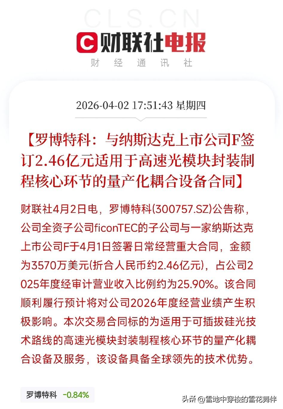 罗博特科签了2.46亿大单,硅光模块的春天来了 刚刷到一条消息,罗博特科子公司跟一家纳斯达克上市公司签了合同,金额3570万美元,折合人民币2.46亿元,占去年营收的25.9%。设备是用于高速光模块封装制程的耦合设备,走的是硅光技术路线。 硅光,光模块,耦合设备,这几个词放在一起,懂的都懂。 AI算力需求爆发,服务器之间的数据传输靠光模块。以前的光模块用的是传统技术,现在硅光技术成了下一代方向。罗博特科这单,说明硅光模块的量产化在加速,设备需求开始放量。 2.46亿,对罗博特科这个体量的公司来说,不是小数目。更重要的是,客户是纳斯达克上市公司,说明技术得到了国际大厂的认可。这不光是钱的问题,是赛道卡位的问题。 光模块板块今年波动大,涨的时候猛,回调的时候也狠。今天A股光模块概念还在调整,中际旭创被砸了十几个亿。但罗博特科这个订单,是实打实的业绩,不是故事。 AI算力的主线没变,只是资金在板块间轮动。今天跑去油气、医药避险,明天可能又回来。蹲在赛道里,等风来,比追风跑更重要。 投资这事,说到底就是看准方向,管住手。光模块的长期逻辑没变,短期波动都是正常的现象。 炒股想少走十年弯路,一定要读这两本经典。 《股票大作手回忆录》修心,《股票大作手操盘术》练手。百年交易智慧,至今不过时。看懂趋势,管住手,才能稳定盈利。 一套两本,股民必备,左下角下单。 硅光CPO