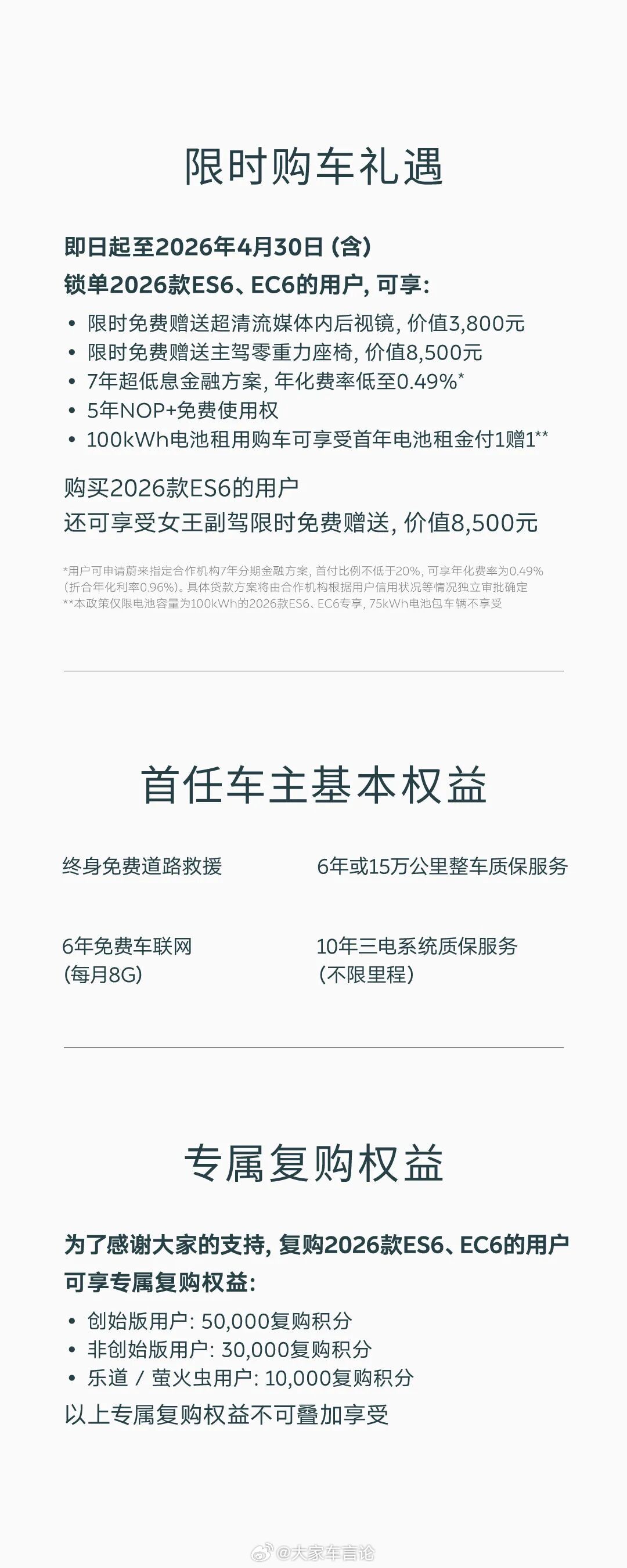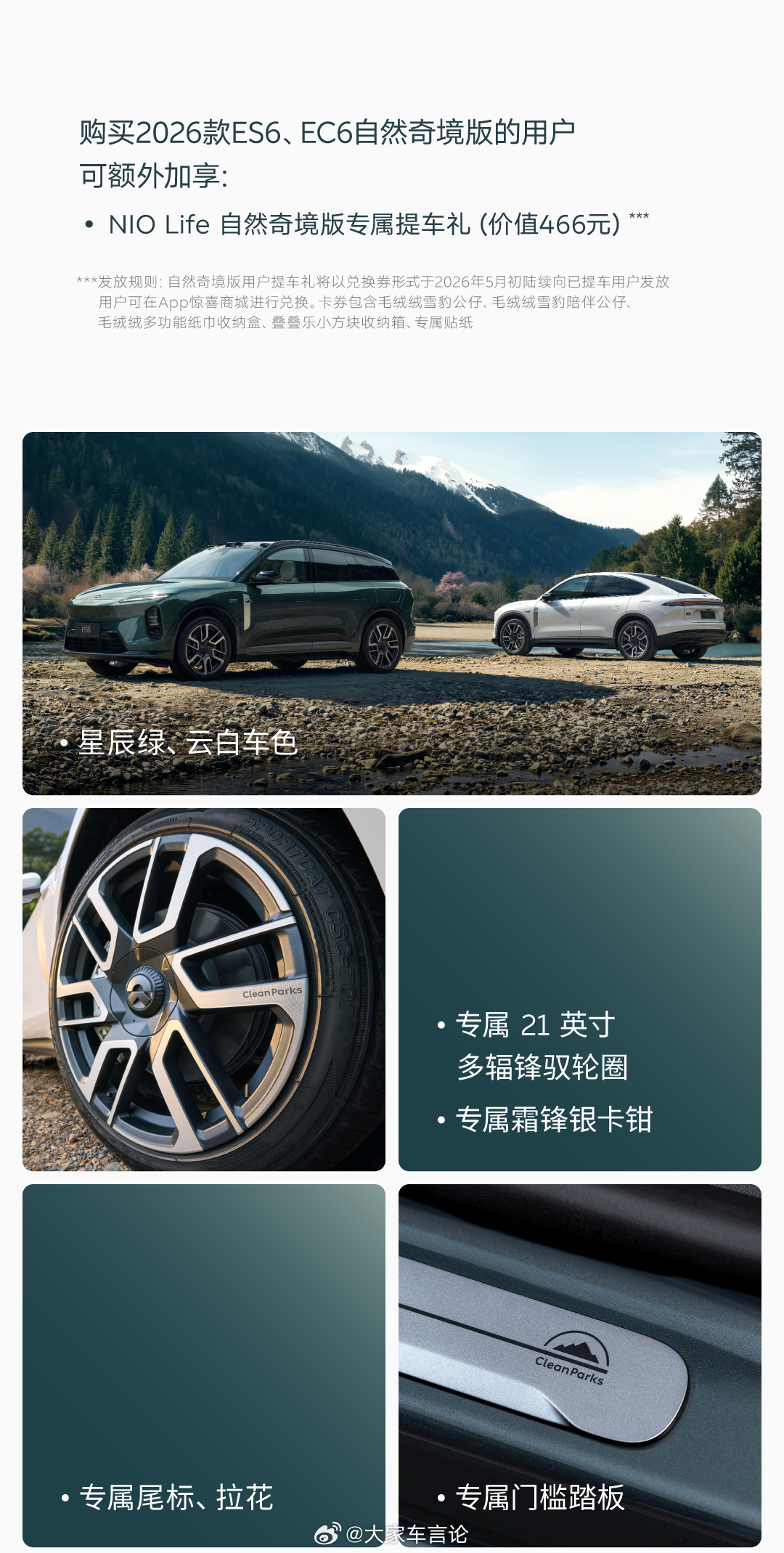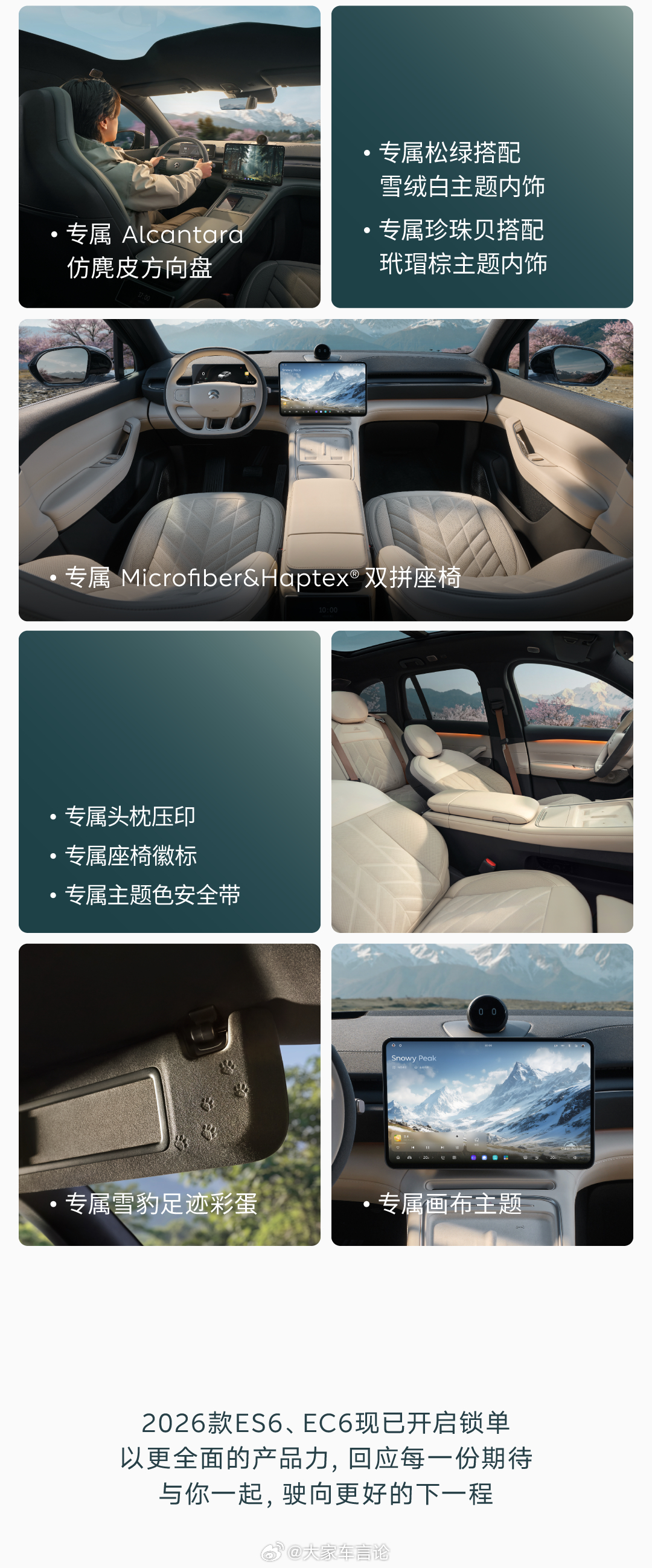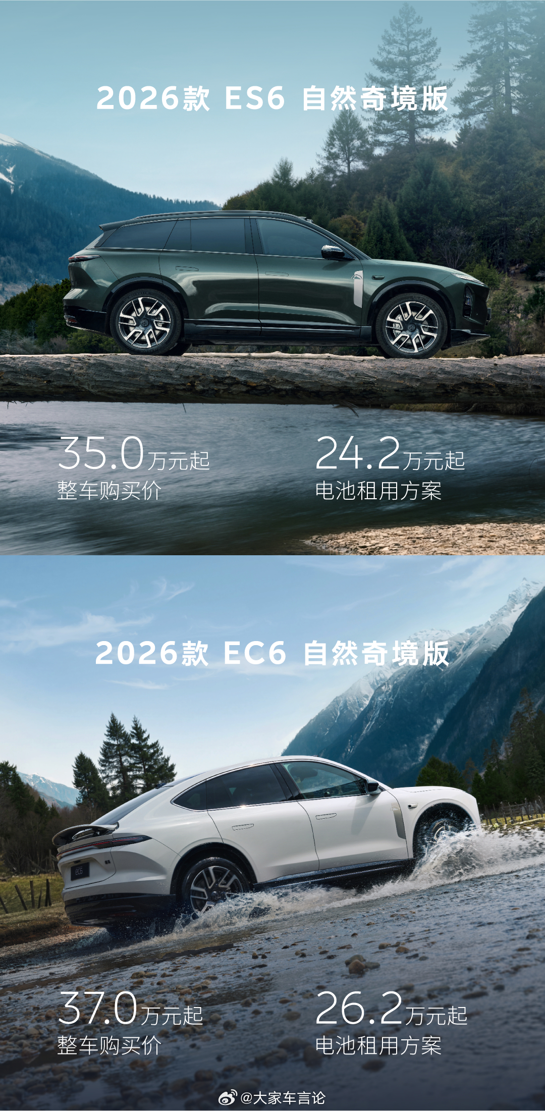 26款ES6/EC6携「自然奇境版」同时登场。ES6 整车购买价33.8万起,BaaS电池租用方案23万起;「自然奇境版」整车购买价35万起,BaaS电池租用方案24.2万起。EC6 整车购买价35.8万起,BaaS电池租用方案25万起;「自然奇境版」整车购买价37万起,BaaS电池租用方案26.2万起。