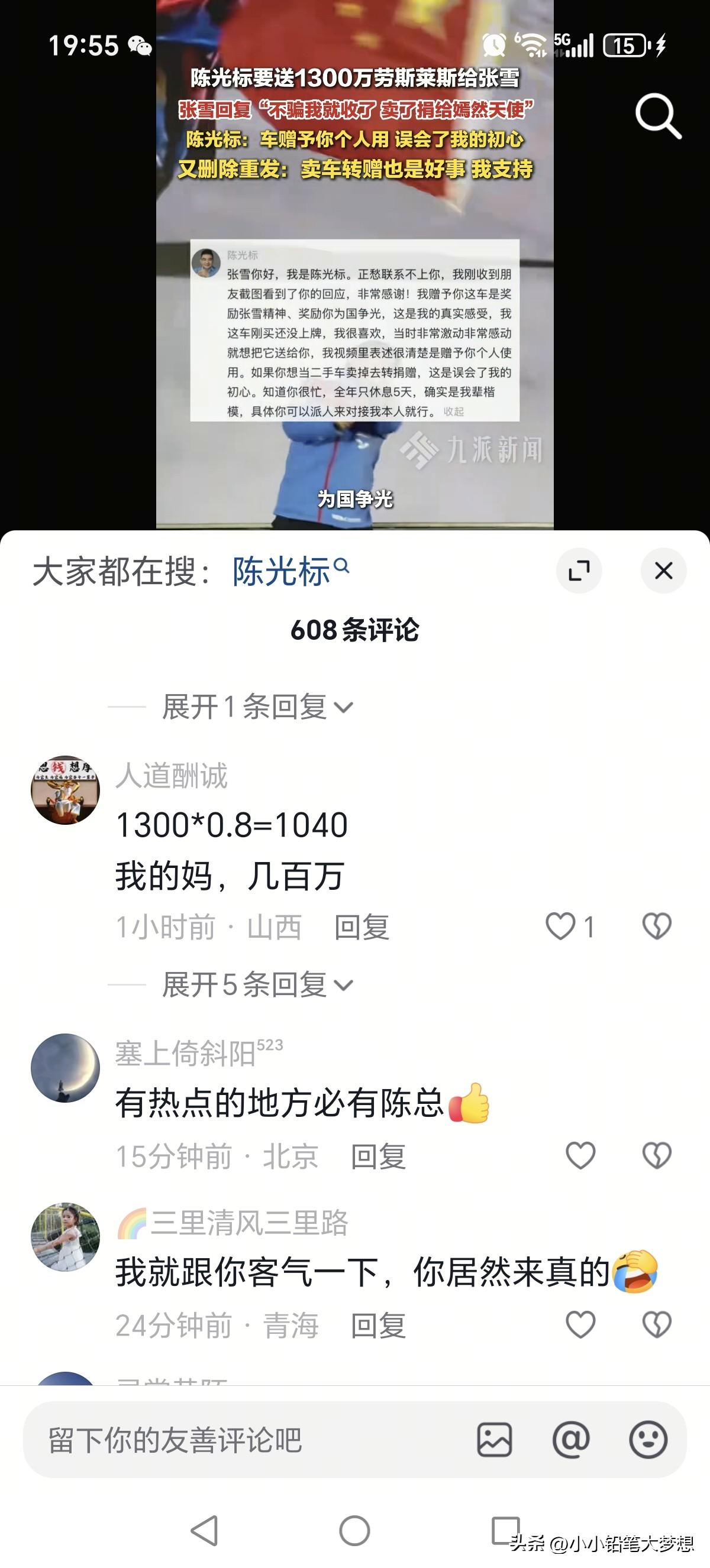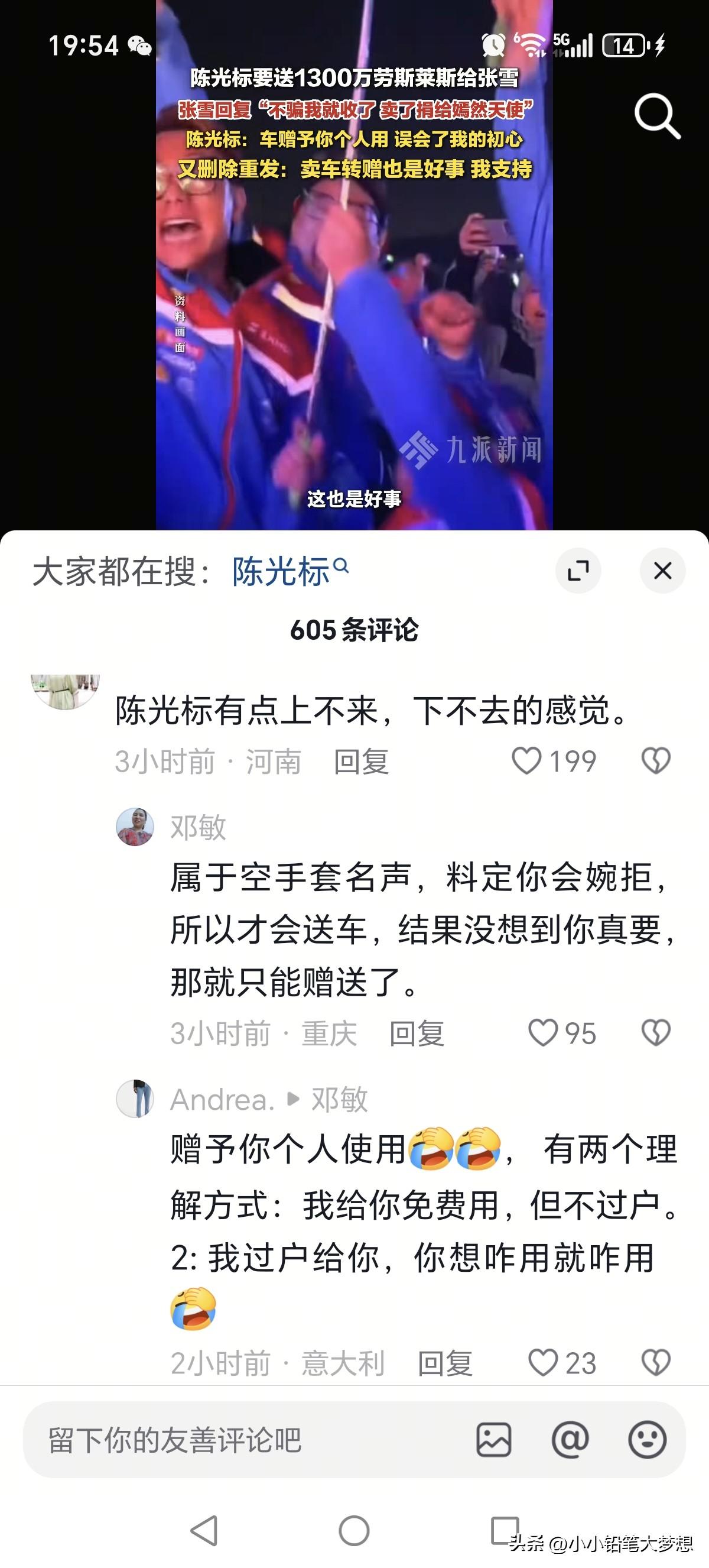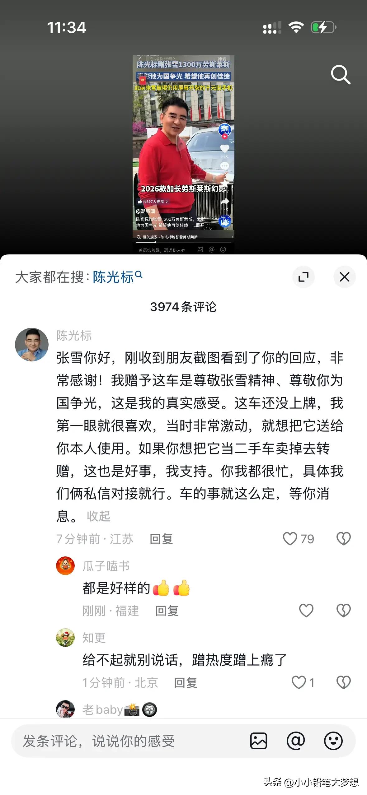 实在太搞笑!说好要送的,现在又说只是使用权,然后私底下聊,慈善家陈光标搞这一出,算是碰到硬骨头了。 近日,著名慈善家陈光标在社交平台上对张雪喊话说要送价值1300万的劳斯莱斯给他,还说这一台价值1300万的劳斯莱斯是2026年的最新款幻影加长版,当时看到李雪夺了两个冠军,觉得他是为国家争得荣誉的人,就应该得到嘉奖,所以就决定把这台车赠送于他,希望各个媒体帮忙转告,而且这台车已经运送到南京了,让他做一下交付手续。 他还细致说明了自己不是冲动的,而是觉得他夺得了世界超级摩托车大赛,从一无所有到撑起了中国摩托车的希望真的是不容易! 张雪看到了这个消息也在自己的社交平台上做出了回应,大概的意思是说这么贵重的车,我用不着,我还是用我的面包车吧,这辆车对于我来说不太实用,折现吧,你之前答应过给嫣然基金捐款的但没有兑现,那这一次我就帮你一把吧,找个二手车商接收一下,八折回收就好,这些折现的钱就赠与嫣然天使基金吧的。 本来吧,陈光标觉得张雪不可能收的,那么蹭个热点也好,他就名利双收了,结果呢?张雪这一招绝了,直接推波助澜吧,帮他做一件好事也好,结果这事一出,陈光标立马回应了,大概的意思这个车我很喜欢,说送给你我一时激动了,我也只是想把使用权给你,哎,如果你真卖了,就误会我的初心! 他发现这句话就不对,就立马删除了,然后改成我没想到你真的想要把它卖掉,现在话都说出去了,那卖掉就卖掉吧,我们私下聊一聊吧! 老天爷,话都说出去了,你说送,现在又说只是送使用权,又说自己激动了,这话说出去了,也不好收回吧,现在就要看陈光标到底送不送! 张雪也是高手,直接把他架火上了,送吧我拿去卖了做慈善,不送吧,你这说话不算话,还有点阻做慈善的意思了!你还是打着大慈善家的名号呢,如果真不送,那不成了不支持公益了吗?那不妥妥打脸了吗? 这是要拍大腿的节奏。。。
