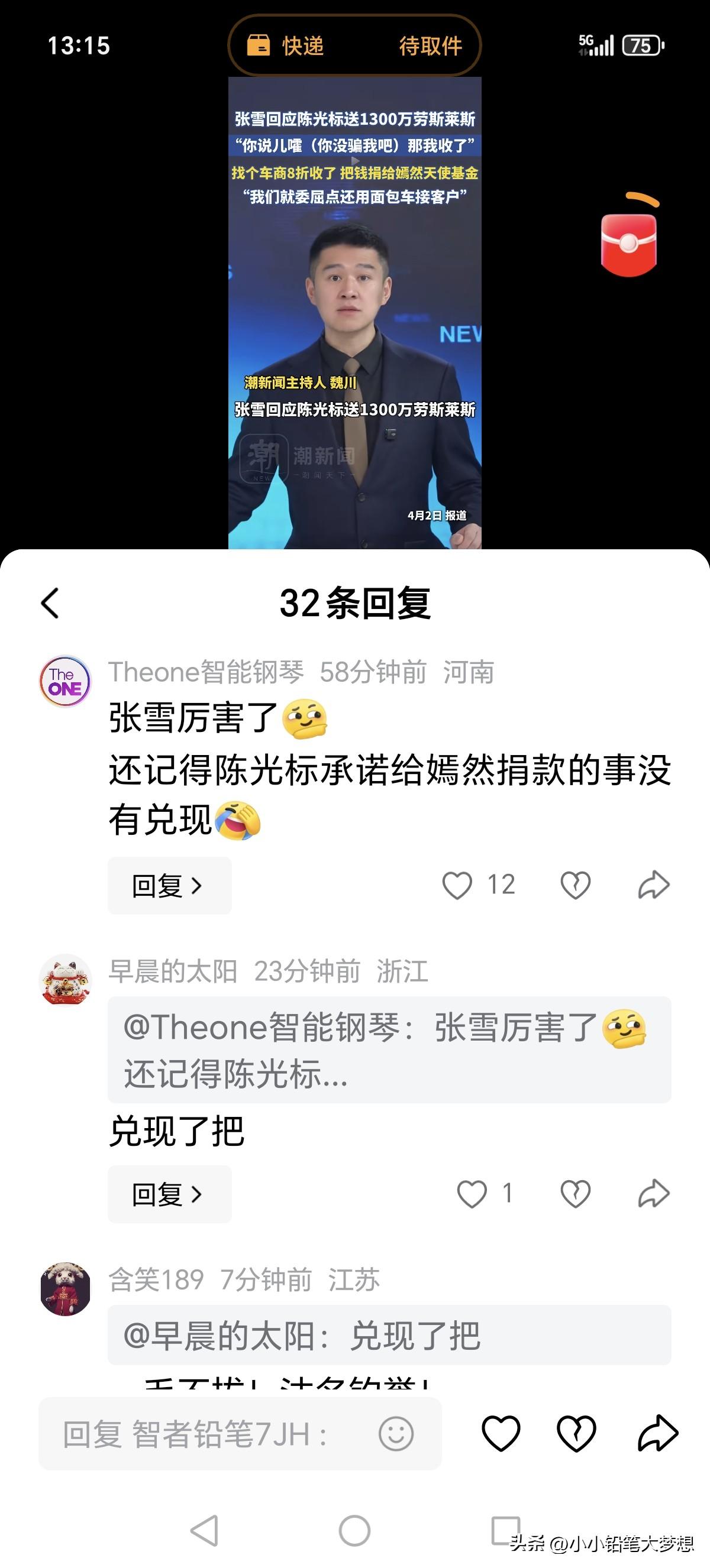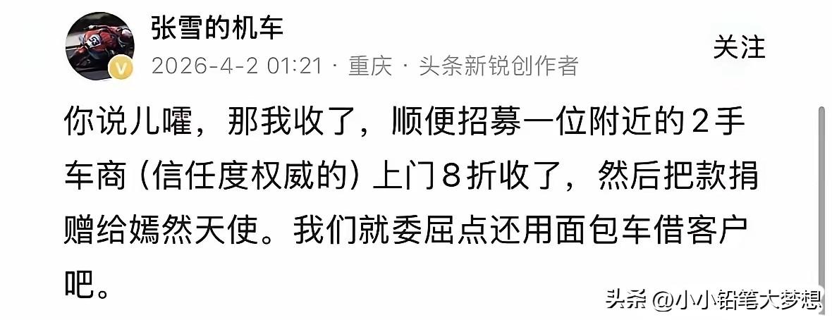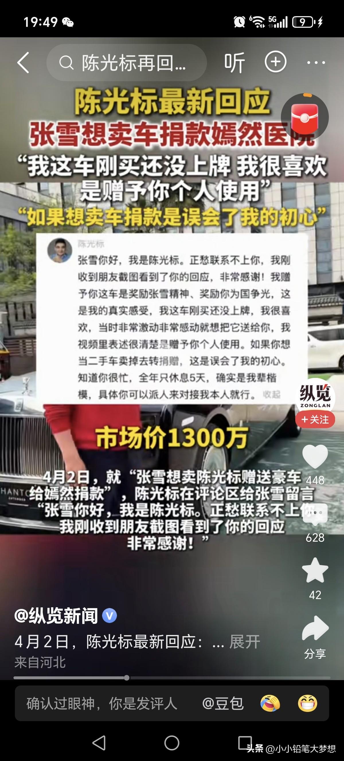 实在太搞笑!说好要送的,现在又说只是使用权,然后私底下聊,慈善家陈光标搞这一出,算是碰到硬骨头了。 近日,著名慈善家陈光标在社交平台上对张雪喊话说要送价值1300万的劳斯莱斯给他,还说这一台价值1300万的劳斯莱斯是2026年的最新款幻影加长版,当时看到李雪夺了两个冠军,觉得他是为国家争得荣誉的人,就应该得到嘉奖,所以就决定把这台车赠送于他,希望各个媒体帮忙转告,而且这台车已经运送到南京了,让他做一下交付手续。 他还细致说明了自己不是冲动的,而是觉得他夺得了世界超级摩托车大赛,从一无所有到撑起了中国摩托车的希望真的是不容易! 张雪看到了这个消息也在自己的社交平台上做出了回应,大概的意思是说这么贵重的车,我用不着,我还是用我的面包车吧,这辆车对于我来说不太实用,折现吧,你之前答应过给嫣然基金捐款的但没有兑现,那这一次我就帮你一把吧,找个二手车商接收一下,八折回收就好,这些折现的钱就赠与嫣然天使基金吧的。 本来吧,陈光标觉得张雪不可能收的,那么蹭个热点也好,他就名利双收了,结果呢?张雪这一招绝了,直接推波助澜吧,帮他做一件好事也好,结果这事一出,陈光标立马回应了,大概的意思这个车我很喜欢,说送给你我一时激动了,我也只是想把使用权给你,哎,如果你真卖了,就误会我的初心! 他发现这句话就不对,就立马删除了,然后改成我没想到你真的想要把它卖掉,现在话都说出去了,那卖掉就卖掉吧,我们私下聊一聊吧! 老天爷,话都说出去了,你说送,现在又说只是送使用权,又说自己激动了,这话说出去了,也不好收回吧,现在就要看陈光标到底送不送! 张雪也是高手,直接把他架火上了,送吧我拿去卖了做慈善,不送吧,你这说话不算话,还有点阻做慈善的意思了!你还是打着大慈善家的名号呢,如果真不送,那不成了不支持公益了吗?那不妥妥打脸了吗? 这是要拍大腿的节奏。。。