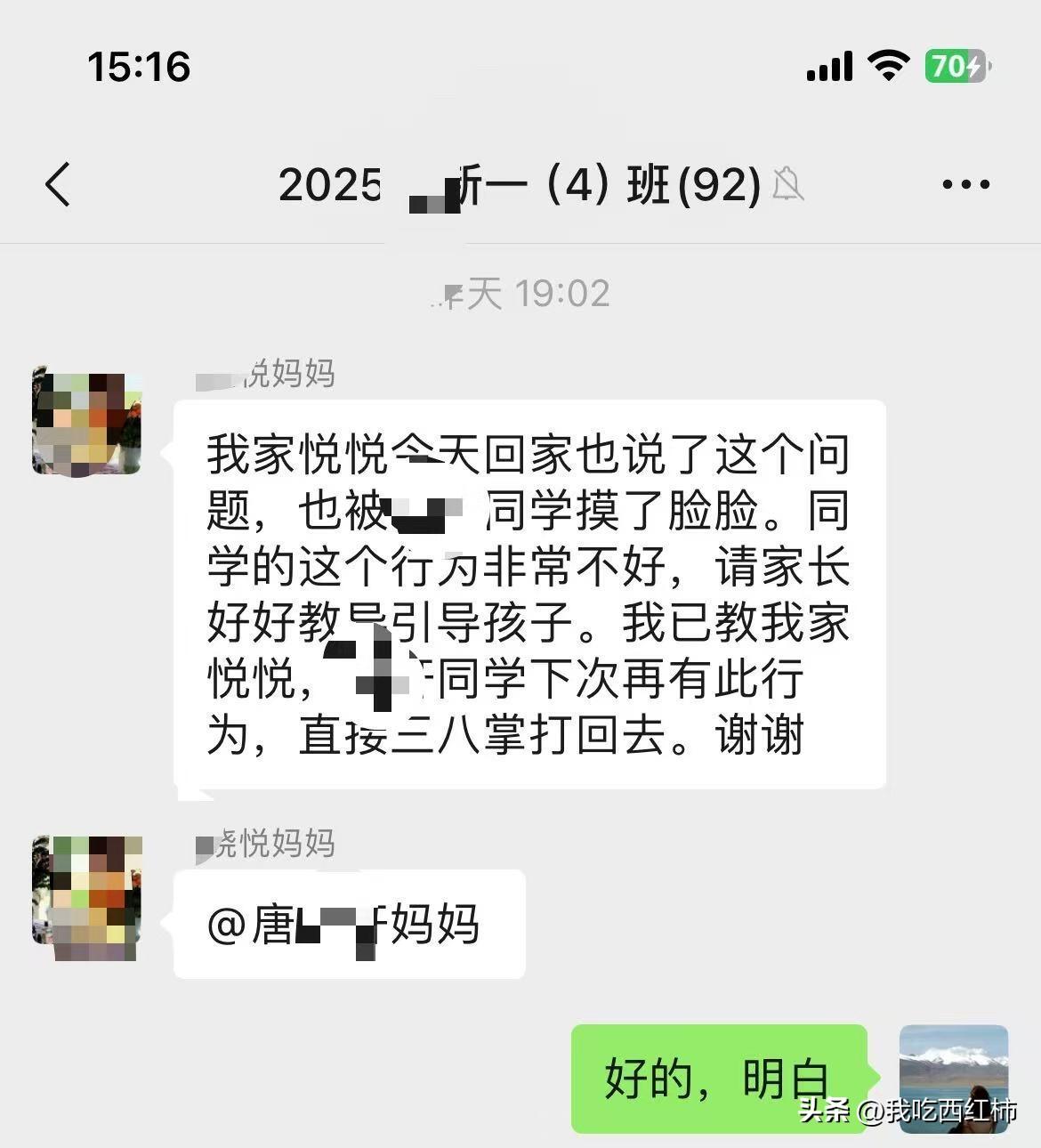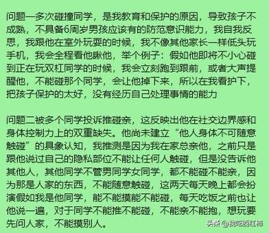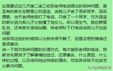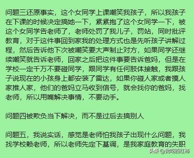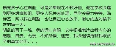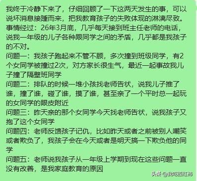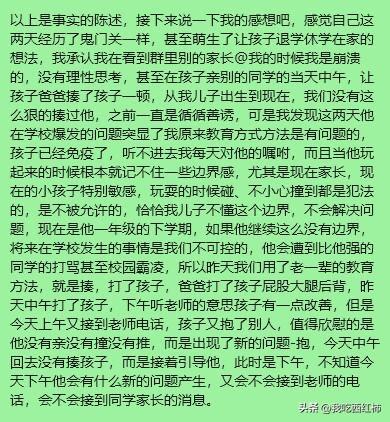 小学的家长教教我这个一年级的弱鸡妈妈吧 我终于冷静下来了,仔细回顾了一下这两天发生的事,可以说坏消息接踵而来,把我教育孩子的失败体现的淋漓尽致。 以上图是事实的陈述,接下来说一下我的感想吧,感觉自己这两天经历了鬼门关一样,甚至萌生了让孩子退学休学在家的想法,我承认我在看到群里别的家长@我的时候我是崩溃的,没有理性思考,甚至在孩子亲别的同学的当天中午,让孩子爸爸揍了孩子一顿,从我儿子出生到现在,我们没有这么狠的揍过他,之前一直是循循善诱,可是我发现这两天他在学校爆发的问题突显了我原来教育方式方法是有问题的,孩子已经免疫了,听不进去我每天对他的嘱咐,而且当他玩起来的时候根本就记不住一些边界感,尤其是现在家长,现在的小孩子特别敏感,玩耍的时候碰、不小心撞到都是犯法的,是不被允许的,恰恰我儿子不懂这个边界,不会解决问题,现在是他一年级的下学期,如果他继续这么没有边界,将来在学校发生的事情是我们不可控的,他会遭到比他强的同学的打骂甚至校园霸凌,所以昨天我们用了老一辈的教育方法,就是揍,打了孩子,爸爸打了孩子屁股大腿后背,昨天中午打了孩子,下午听老师的意思孩子有一点改善,但是今天上午又接到老师电话,孩子又抱了别人,值得欣慰的是他没有亲没有撞没有推,而是出现了新的问题-抱,今天中午回去没有揍孩子,而是接着引导他,此时是下午,不知道今天下午他会有什么新的问题产生,又会不会接到老师的电话,会不会接到同学家长的消息。 揍完孩子心在滴血,可是如果现在不教好他,他在学校会遇到更多艰难险阻,更多人际关系处理,同学冷暴力等等,贴标签,所以我在调整,也让自己心态放平,耐心的应对接下来的每一天。 胡乱的写了一堆,我的词汇有限,文字很难表达出我内心的煎熬,自责,无奈,不知所措,迷茫,我会继续更新我跟孩子的真实经历