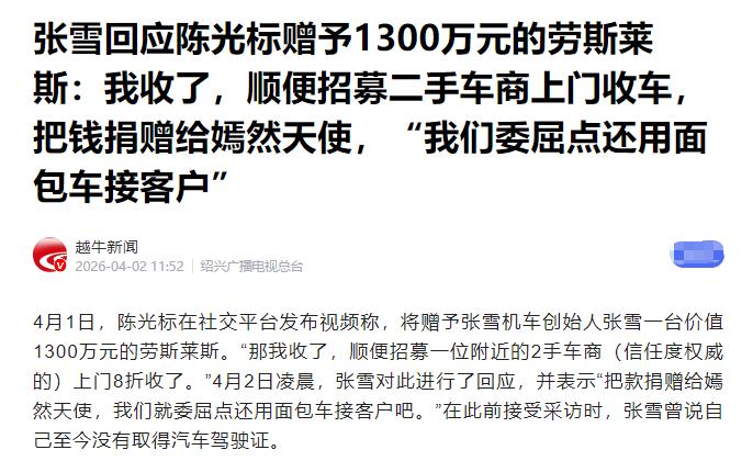 4月1日,富商陈光标突然发出视频,并公开承诺,要赠送张雪价值1300万的劳斯莱斯幻影,而且还是全国2026款唯一一辆的加长版! 知道陈光标不差钱,向来出手的阔绰,也是早已为人熟知,但这次直接以顶级豪车相赠的豪气举动,还是让不少网友感叹这真是惺惺相惜的强强联合场面! 但是以张雪的个性,怕是不会收标哥这么贵重的礼物 张雪这人,从来就不喜欢铺张浪费、追求奢华。他是从湖南怀化农村出来的,16岁就去当修车学徒,早年还有人拍到过他在雨里追了3小时车,能看出来骨子里就有股韧劲。 现在就算赚了大钱、身价上亿,他也还是那么务实,平时用的手机还是屏幕裂了的旧华为,上下班骑摩托车,公司接待客户,用的居然还是面包车。 在他眼里,车就是个代步的工具,能开、能用就行,不管多贵、多有名气,对他来说都一样。 更关键的是,张雪到现在都没有汽车驾照,就算真收下这台劳斯莱斯,他自己也开不了,总不能专门雇个司机,天天围着这台车转吧?张雪一门心思都在造车上,收下这台车,不是给他添光彩,反而成了累赘。 再看张雪做事业的样子,就知道他根本不屑于靠别人送的贵重礼物撑场面。 2024年,他从凯越离职后,干脆把自己的房子抵押了,创办了自己的机车品牌,还把自己的名字刻在品牌上,等于把自己所有家当都押进去了。 他研发的820RR-RS赛车,核心技术都是自己家的,没有依赖别人,市售的高配版也就6万多,但他在研发上花的钱,占比高达9.33%,比行业里大多数品牌都多。 为了保证车子质量,他甚至规定,前1000台车不卖,全部拿去跑百万公里测试,确认没问题再上市。 他常说,自己造车不是为了赚大钱,就是想造咱们中国人自己的好车。这么一个把所有心思都放在技术和车子上的人,哪有功夫去琢磨怎么保养一台1300万的豪车? 对他来说,在赛场上拿冠军、把技术做好、让全世界都认可中国机车,这才是真荣耀,比一台劳斯莱斯值钱多了。 除此之外,张雪做人做事有自己的规矩,从来不会平白无故收别人的贵重东西,更不想被这种高调的送礼绑住手脚。 他在国际赛场上受过不少委屈,早年去参加比赛,外国人都看不起他,直到他靠真本事拿了成绩,才换来别人的尊重。他比谁都清楚,制造业的脸面,不是靠别人送豪车撑起来的,是靠一次次试错、一次次调整、一次次返工,慢慢磨出来的。 就连给经销商定规矩,他都特别认真,驾龄不到一年的新手,不能买820RR系列,哪怕这样会少卖10%的车子,他也坚持,就因为不想让新手开快车出事故。 这么一个有自己原则、有底线的人,怎么可能收下一台会被人说“靠别人送礼上位”的豪车?这不仅不符合他的性子,还可能让他这么多年打拼攒下的好名声,变得不好听,太不划算。 就算张雪真收下这台豪车,后续的麻烦也不少。先不说每年保养、买保险要花一大笔钱,单是把车子转到自己名下,要交的税就够头疼的。 虽然个人收礼物要交税,有明确的规定,但1300万这么大一笔钱,后续肯定会有人议论、关注,惹来不少麻烦。 张雪向来低调,不爱张扬,最不想被这些无关紧要的事分散注意力,他就想安安静静造自己的车、搞自己的研发,根本不想被“收不收礼”这事缠上,浪费时间和精力。 果然,没过多久张雪就回应了这事,既没直接拒绝让陈光标下不来台,也没顺着台阶收下礼物,分寸拿捏得特别好。 他说,会把这台劳斯莱斯打八折卖给二手车商,卖车的钱,全部捐给嫣然天使基金,他自己还是照样用面包车接待客户。 这个回应,就能看出张雪很通透,既领了陈光标的好意,没让对方难堪,又守住了自己的本心,没被豪车诱惑。 他不想让这份送礼,变成一场高调的作秀,更不想自己变成别人作秀的工具,在他看来,好意就该用在有用的地方,没必要变成一台放着不用的豪车,中看不中用。 说到底,张雪不收这份厚礼,最主要的还是没忘自己当初为啥要造车。他从一无所有,拼到现在的成绩,靠的不是别人送东西,而是不服输的劲,还有对造车的专注。 他想要的,从来不是表面的风光,而是让中国机车能在世界上站稳脚跟,让咱们中国人能开上自己造的好车。 所以不管外界怎么起哄,怎么羡慕这份天上掉下来的好事,张雪都能保持清醒,知道自己该干什么、该坚守什么。这样的人,肯定不会被眼前的奢华诱惑,也正是这份清醒和务实,他才能在竞争那么激烈的制造业里闯出名堂,成为咱们中国人的骄傲。 这场看似热闹的送礼风波,也让大家明白一个道理:真正厉害的人,不用靠别的东西证明自己,他们自身的本事和坚守,就已经很耀眼了。