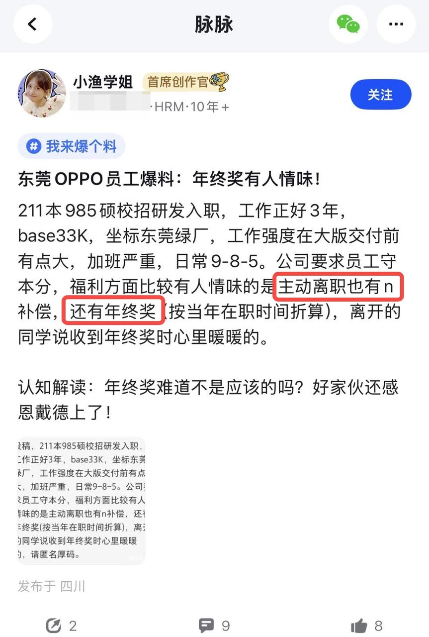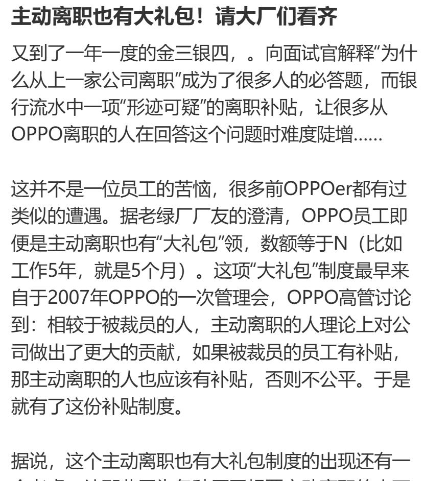 真的,好好读书,认真找工作才是zui实在的事!!! 不怪人家挤破头了也想进大厂 论福利待遇什么的确实是有些大厂更靠谱!!! 比如最近就刷到了平台上有人在讨论说OPPO员工的离职经历 居然连员工自己主动提的离职都是给N 感觉就是补偿很到位、流程也体面 包括入职前有安排体检 入职后每年也同样都体检的报销额度 感觉大厂在人文关怀这方面还是下了很多心思的~ 有点后悔当年没好好读书 感觉这辈子估计是没啥机会进大厂见见世面了 离职 打工人 不想上班 大厂离职 OPPO OPPO服务 加油打工人 当牛做马又一天 大厂资讯