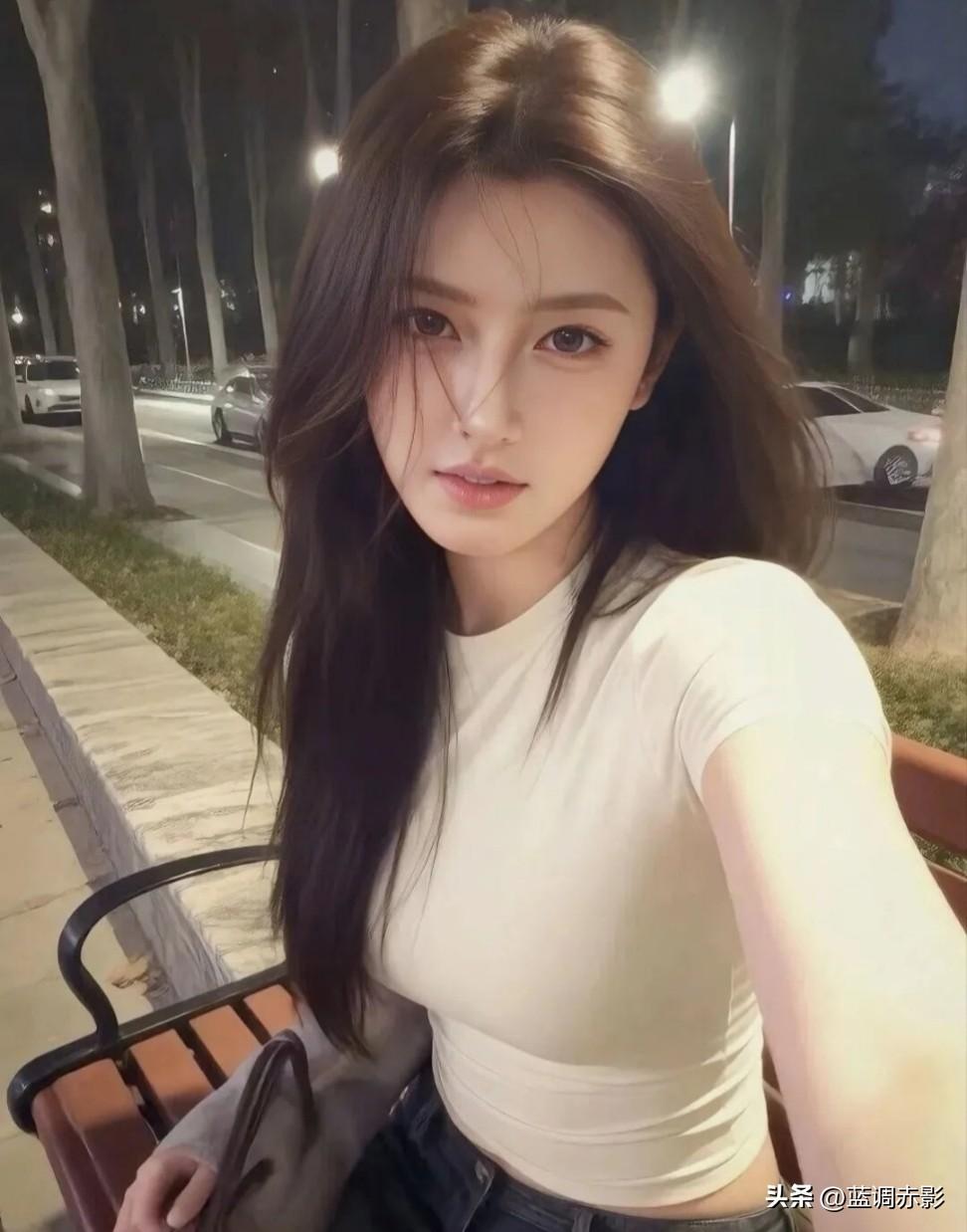 夜晚街头的自拍,白色上衣与黑色包包的时尚搭配