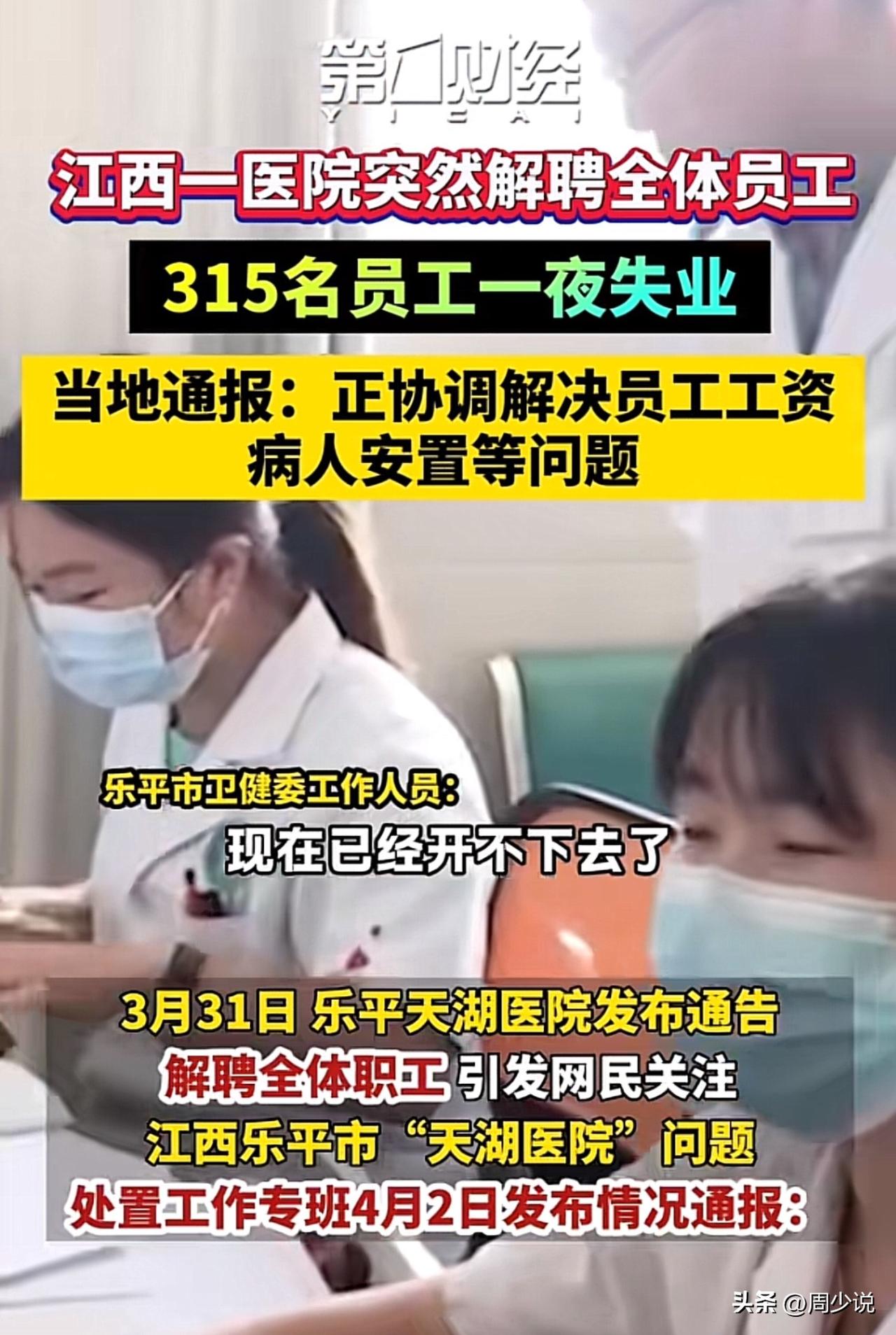 炸裂!江西一医院突然解聘全体员工,315名员工一夜之间集体失业。而失业的原因是,医院已经停掉了医保业务,导致医院陷入经营困难,直接开不下去了。 看到这个消息,周少不得不说确实挺让人唏嘘的,有一个网友分析的很透彻,事实证明,民生的相关产业,比如教育、医疗和养老,向私人开放,这条路似乎走不通。因为他一旦要赚钱,那么老百姓就承受不了。反之,他不赚钱那么一定会倒闭。 当然,不管怎么样,还是希望当地相关部门好好解决员工工资以及病人安置等问题吧。#周少说教育# #寻美三湘# #寻美湖南#