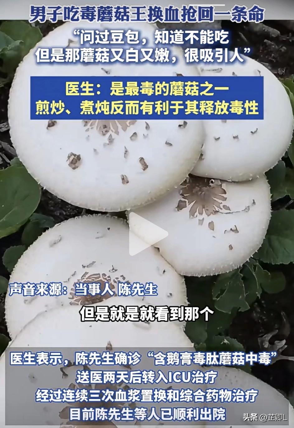 AI都劝不住!广东男子明知是毒蘑菇,还煲汤给全家喝,结果悲剧了:三次换血才抢回了一条命! 简直就是在拿命尝鲜! 广东中山一男子,在野外看到刚长出来的野蘑菇,白白嫩嫩、看着特别诱人,直接摘回家煲汤。 离谱的是,他明明先问过AI,AI非常明确告诉他:这是毒蘑菇,不能吃!不能吃!不能吃! 可他就是架不住诱惑,中午自己先吃了点试了试,感觉没事,晚上又跟家人一起吃。 结果没多久,一家人全都中毒不适,紧急送医。男子吃的多中毒最深,送医两天被转入ICU,经历了三次换血和药物治疗以后,才捡回了一条命! 医生介绍,这种蘑菇是白毒伞,剧毒!是最毒的蘑菇之一! 而且这种白毒伞,煮、炒、炖不仅仅去不掉毒性,反而越煮越毒,严重可致命。 男子自己都承认:明知道不能吃,就是看着太好看了,没忍住。 再次提醒所有人: 不认识的路边野蘑菇,再好看、再新鲜,一律别摘、别煮、别吃! 别拿侥幸心理,赌自己和家人的命! 素材来源:农林卫视,侵联删!