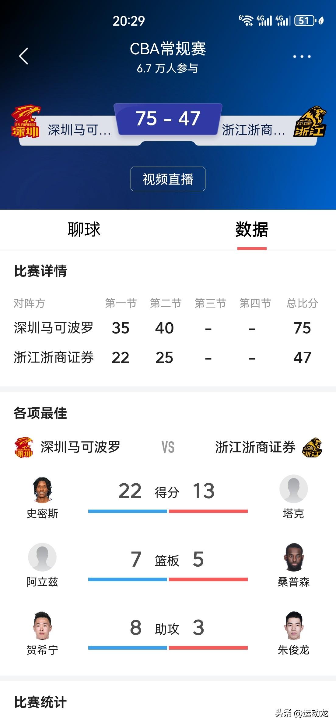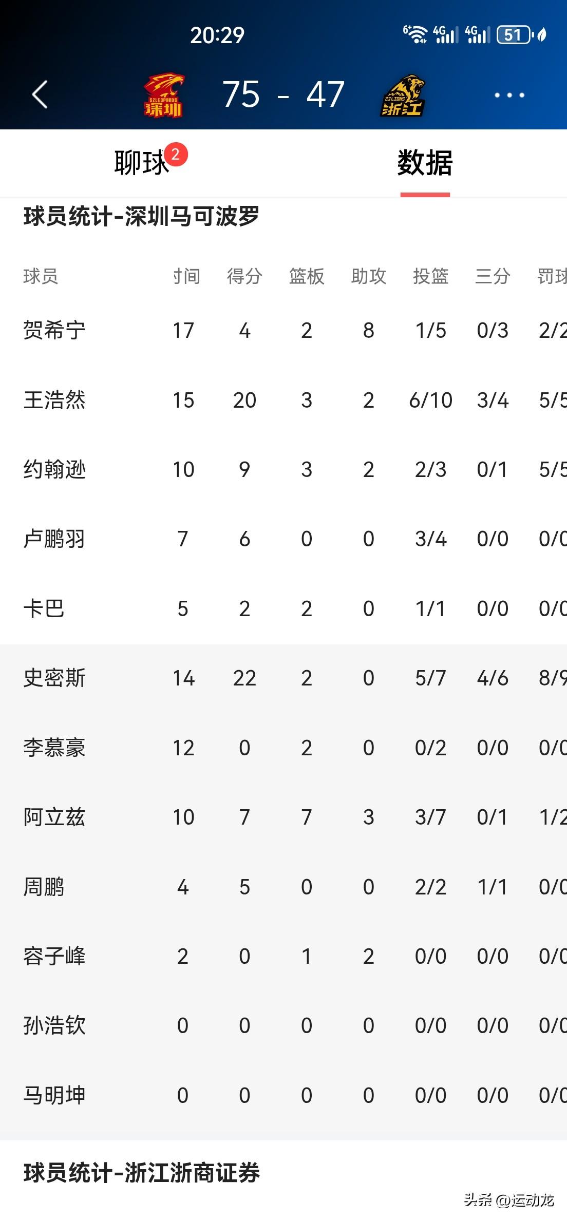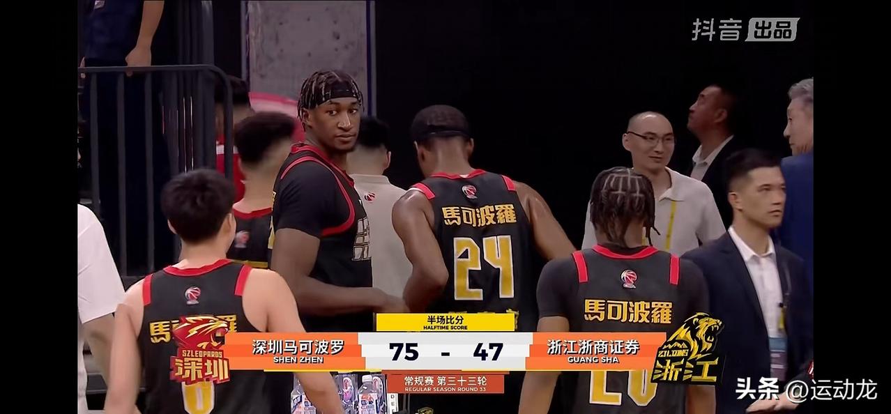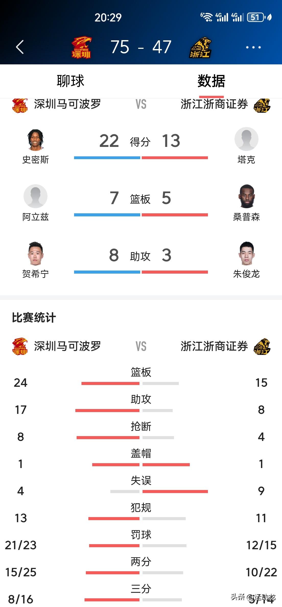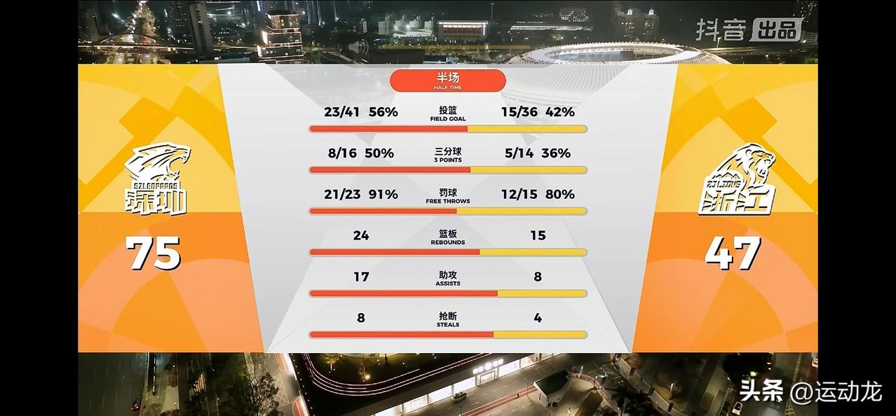 打疯了!半场轰下75分几乎已击溃卫冕冠军! 深圳队三分球16投8中,命中率50%,罚球23中21,命中率91%,篮板球数24:15,助攻数17:8,抢断数8:4,半场75:47领先浙江广厦28分。 深圳队王浩然10投6中,三分球4投3中,罚球5罚5中,砍下20分3篮板2助攻;史密斯7投5中,三分球6中4,罚球9中8,砍下24分2篮板。