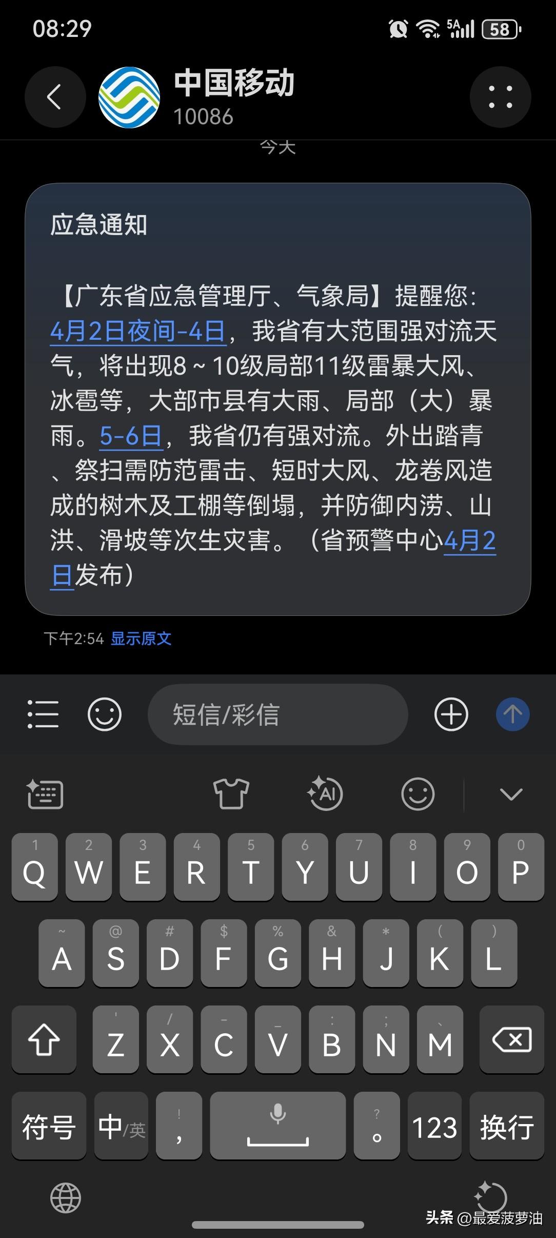 下午2:54收到到省预警中心的短讯通知:“【广东省应急管理厅、气象局】提醒您:4月2日夜间-4日,我省有大范围强对流天气,将出现8~10级局部11级雷暴大风、冰雹等,大部市县有大雨、局部(大)暴雨。5-6日,我省仍有强对流。外出踏青、祭扫需防范雷击、短时大风、龙卷风造成的树木及工棚等倒塌,并防御内涝、山洪、滑坡等次生灾害。(省预警中心4月2日发布)”