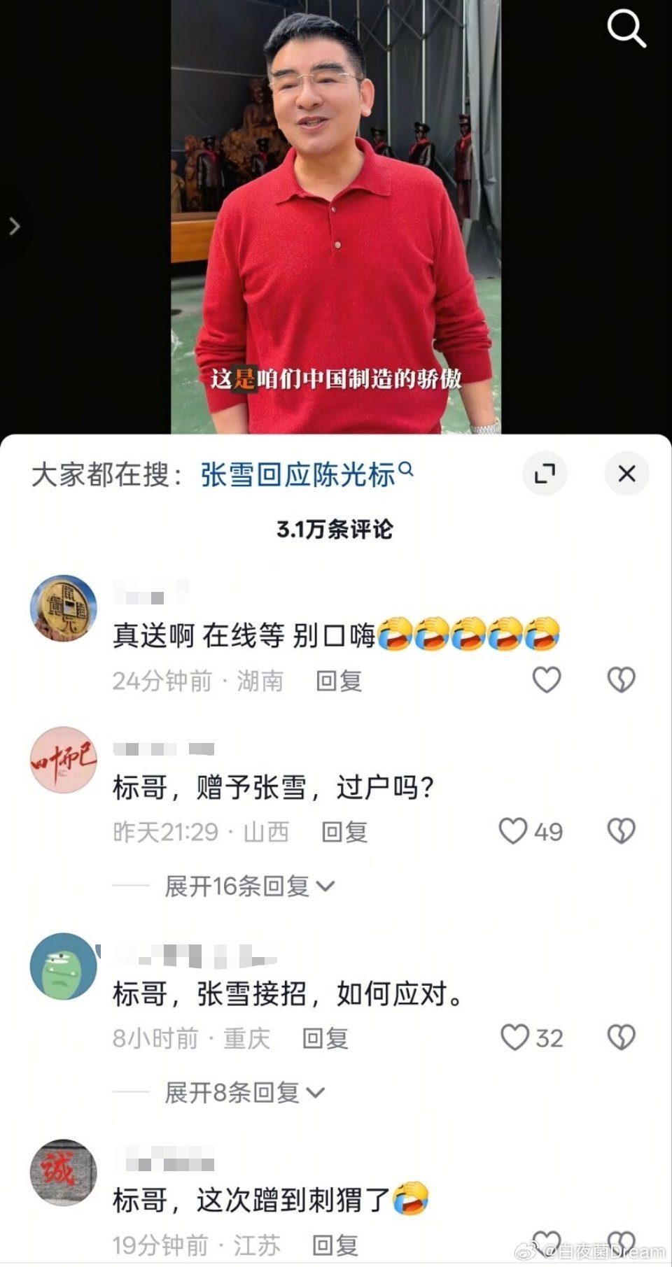 陈光标回应张雪要卖车刚刚看了陈光标的评论区,挺有意思的,就是不知道是不是真送,反
