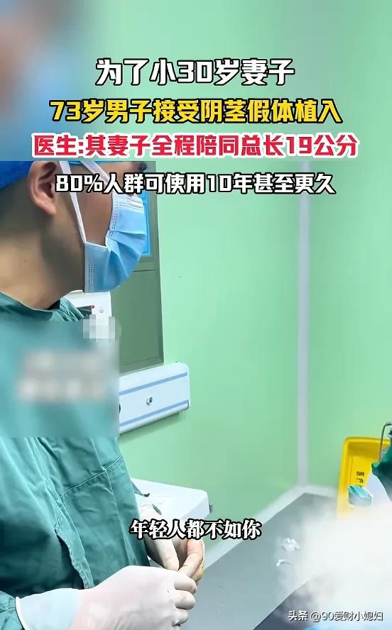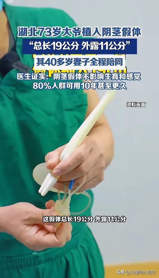 网友震惊了:湖北武汉,73岁大爷为了小30岁妻子的性福生活,选择做阴茎假体植入手术,妻子也十分支持,在医院全程陪同!网友:这是真爱! 大爷娶了一个比自己小30岁的妻子,一开始大家都不看好他们,觉得这个女的是图大爷的钱,可只有大爷知道,他们是真心相爱的,婚后也过得很幸福,等着看笑话的人们慢慢的开始羡慕大爷,见到大爷就夸他很有福气能娶到一个小娇妻。 大爷常常笑笑不说话,大家只看到了表面,却不知道他心里的痛,他有一个难言之隐——他给不了妻子性福!原来随着年龄的增长,他明显的力不从心了,可妻子正是风华正茂的年龄,夫妻生活方面肯定是有需求的,他没办法满足,他心里很愧疚也很担心因此影响夫妻感情。 可妻子却安慰他没关系的,不管怎样她都不会离开大爷的,当初选择大爷她就做好了准备了。看着这么体贴的妻子,大爷更是觉得自己对不起妻子。他也看过很多医生,药也吃了不少,可没用。 后面无意中他知道了现在医术有针对他这种的治疗办法,那就是植入阴茎假体,查阅了资料后,大爷决定去做这个手术。 他把自己的想法告诉妻子,妻子也明白丈夫一直对这个耿耿于怀,她没有反对,支持丈夫的决定,于是两人一起去了医院! 医生很惊讶大爷都这个岁数了还要做假体手术,但在了解了大爷的情况后就给大爷安排了,妻子全程陪着大爷。 最终手术很成功,医生给大爷植入的假体总长19cm,体外有11cm,医生还直言大爷现在比年轻人还厉害! 据悉,这个手术不会影响感觉,只要身体没问题,也不会影响生育,根据材质与日常保养,80% 的人可用 10 年甚至更久! 看到这一幕网友感叹:大爷是真爱自己的妻子,这么大的年纪了还愿意为了妻子去折腾! 其实可以理解大爷,毕竟自己的妻子还那么年轻,夫妻生活不和谐肯定会影响夫妻感情的,大爷肯定也是担心妻子会因此离开自己吧,他确实爱妻子,这么大年纪了还要遭一次罪。大爷也是勇敢的,他敢于直面自己的问题,然后去解决,都不像有些男的羞于启齿更是自尊心作祟不肯面对,然后天天疑神疑鬼的,最终导致感情是破裂。 像大爷这样敢于直面问题,有病治病。其实这个没什么的,有问题了治就好了,谁还不生个病呢! 只能说现在的医学是越来越发达了! (信息来源:海报新闻,侵删[祈祷])
