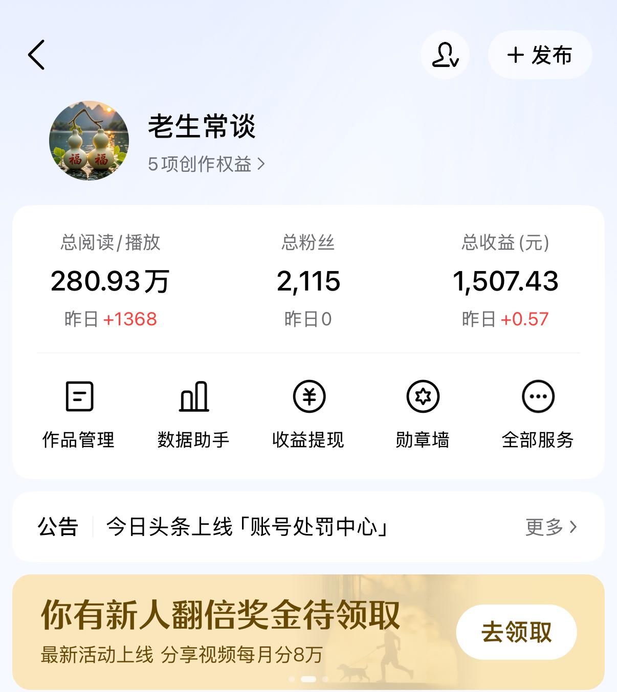 翻到以前单篇赚228块钱的截图,感觉就像做梦一样。单篇文章展现量快150万,阅读量二十多万,收益有200多块钱,那个时候开心半天,真的以为我自己开窍了,以为可以天天吃肉了。 结果现实就是非常狠狠的打脸。从单篇200多掉到现在的一天5毛钱,还是一样的每天更新,每天想,结果最后挣的钱连早餐都吃不起。 然后刷头条天天看着别人晒收益,什么孤舟,苗京京这些大佬,每天动不动就日入几百上千的,说不羡慕都是骗人的,怎么别人轻轻松松就这么多的收益。有时候真想不写算了,太打击人了。 但后来自己琢磨琢磨,可能那篇200多的纯粹就是运气好,瞎猫碰上死耗子,碰巧让大家喜欢看了。 咱普通人写东西,哪有天天出爆款的命啊。回头看看,不知不觉总收益也有1500多了,也攒了2000多个粉丝,其实也算在头条里的佼佼者了。 现在我也想通了,不跟别人比了,也别天天盯着那几毛钱发愁了。想写啥就写啥,就当是个免费的记事本,有人看咱就乐呵乐呵,没人看就当自娱自乐。 不知道头条里的朋友们,你们现在每天都能挣多少钱?有跟我一样天天拿几毛钱“低保”的吗?