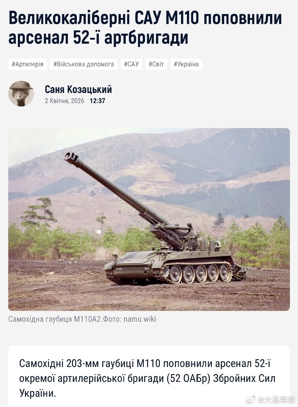 乌军第52炮兵旅已装备203毫米M110自行榴弹炮,据悉这批装备来自希腊提供。