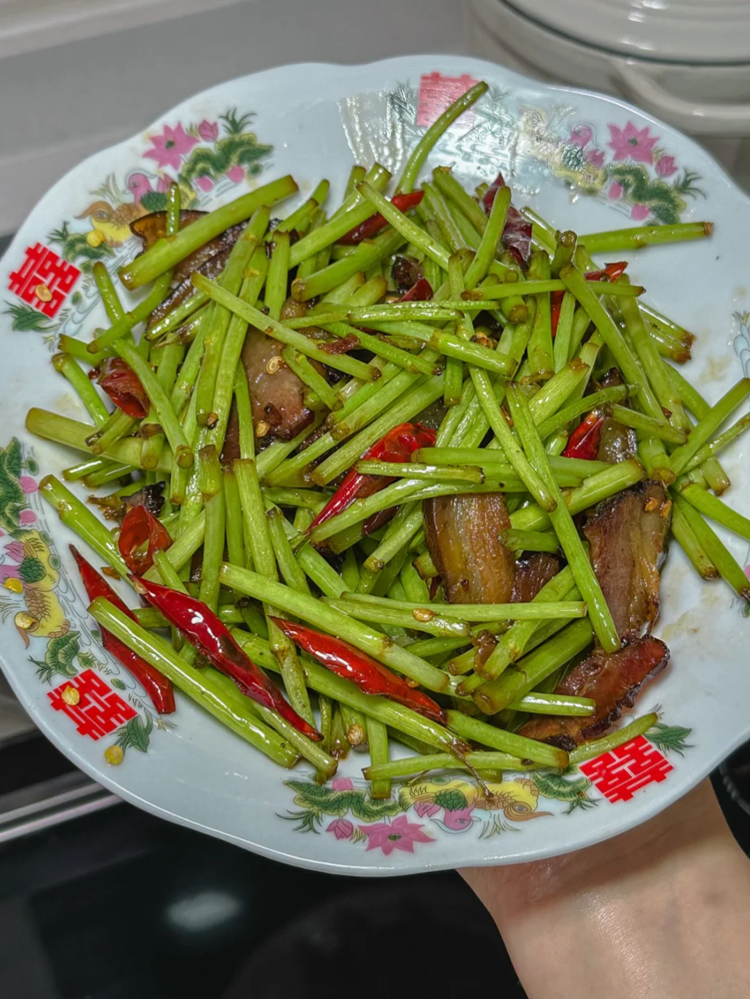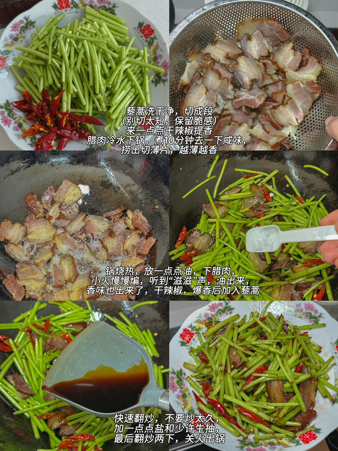 2.锅烧热,放一点点油,下腊肉,小火慢慢煸,听到“滋滋”声,油出来,香味也出来了,干辣椒,爆香后加入藜蒿
