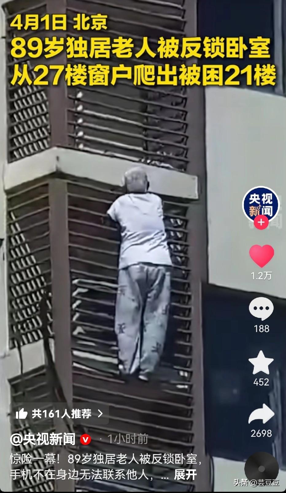 太惊险了!89岁独居奶奶被反锁,从27楼爬窗到21楼,这身体素质估计超越了全国89%以上的人!事后真相让人心酸又心疼! 北京这位89岁独居老奶奶,不慎将自己反锁在卧室,手机落在客厅,无法呼救,屋内也没有食物饮水。绝境之下,她竟选择翻窗求生,没有任何防护措施,89岁的她,靠着超乎常人的意志力,从27楼卧室窗户翻出,一步一步艰难地往下爬,硬生生爬到了21楼,只为寻找一丝生机。 直到消防员火速赶到,从高空将她平安救下,老人虽惊魂未定,身体却依旧硬朗,这份“硬核”让网友惊叹,更让人心酸。 网友纷纷惊叹老人的胆量和体力,可这份“硬核”背后,全是独居老人的无助与心酸。89岁本该安享晚年,却因一把锁被逼到生死边缘,她不是不怕死,是没有退路,只能拿命博生机。 这也给所有子女提了醒:尽孝从不是只给物质保障,独居老人最怕突发意外时无人回应。装一把智能锁、配个紧急呼叫器、常回家看看,就能避免悲剧发生。 愿所有老人都能被妥善照顾,不用再独自面对绝境,安安稳稳度晚年。 你佩服这位奶奶的胆量和身体状况吗?