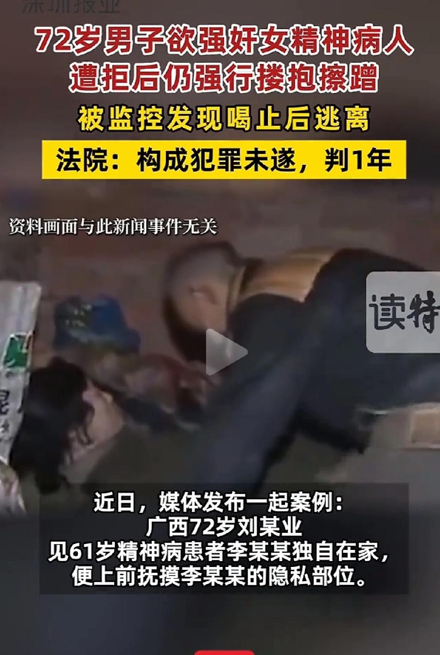 老而无德!广西平南,72岁的刘某,见同村61岁的李某某患有精神分裂症,一个人在家,竟然起了歹念。先是上手抚摸隐私部位,被拒绝后,又掏出钱来引诱。李某还是不肯。刘某干脆撕破脸,强行搂抱、擦蹭,想要直接性侵。幸亏李某的亲属通过客厅监控看到了这一幕,大声喝止,刘某才吓得逃跑。 李某某今年61岁,患有精神分裂症,案发时正处于发病期。经专业鉴定,她当时完全没有性自我防卫能力。 什么意思?就是说她根本不知道别人在对自己做什么,也没法说“不”或者反抗。 那天下午两点,刘某趁她一个人在家,先摸,再拿钱引诱,最后强行施暴。每一步都是在试探,每一步都是在欺负一个没有反抗能力的病人。 案子到了法院,有个争议点:刘某中途停手,到底是“犯罪未遂”还是“犯罪中止”? 这两个词听起来差不多,但意思完全不同。 “未遂”是想干但没干成,是因为外面有人阻止了。 “中止”是自己主动放弃不干了。 法院认为,刘某不是因为良心发现才停手的,而是被监控喝止,怕被人抓住才跑的。 所以是“犯罪未遂”,不是“犯罪中止”。再加上他认罪认罚,最后判了一年。 这里要说明一下,强奸罪的量刑起点是三年以上十年以下。但因为刘某是未遂,可以从轻或减轻处罚,所以最后只判了一年。 正如网友说:“72岁的人了,不说积点德,竟然欺负一个精神病人,还有脸拿钱引诱?这叫什么人?” “一年太轻了!这根本起不到震慑作用。以后是不是谁岁数大都可以干这种缺德事了?” “如果那天没被喝止呢?如果得逞了呢?又能判几年?” 说实话,看了堵得慌。一个监控救了她,但更多人呢? 也幸好李某的亲属还算有警惕心,装了监控,不然那天会发生什么,根本不敢想。 但你想过没有,如果没装监控呢?如果亲属当时没看到呢?这个案子是不是就不会有人知道了? 有网友说得一针见血:“判得轻不轻是一回事,关键是这个案子暴露出来的问题——农村的精神病人谁来保护?” 农村很多精神病人的监护人,要么是年迈的父母,要么是同样身体不好的配偶。自己都需要别人照顾,哪有能力24小时看护一个精神病人? 再加上农村家庭经济条件差,没钱送医,没钱装监控,更没有专业的照护服务。这些人就成了最容易被人欺负的目标。 那些最弱的人——精神病人、独居老人、残疾人——谁又来保护他们? 他们可能不会上网,不会发声,甚至不知道自己被欺负了。但正因为这样,他们更需要被看见、被保护。 一个家庭装个监控,就能救一个人。但如果整个社会对这些问题视而不见,靠一个监控能挡住多少个刘某? 法律讲条款,但老百姓心里有杆秤 法律讲条款、讲证据,这没错。但老百姓心里也有一杆秤。 一个最弱的人被欺负了,欺负她的人只坐一年牢。这让人怎么相信“法律保护弱者”这句话? 保护弱者,不光是法律的事,也是每一个人的事。愿这样的悲剧,越来越少。