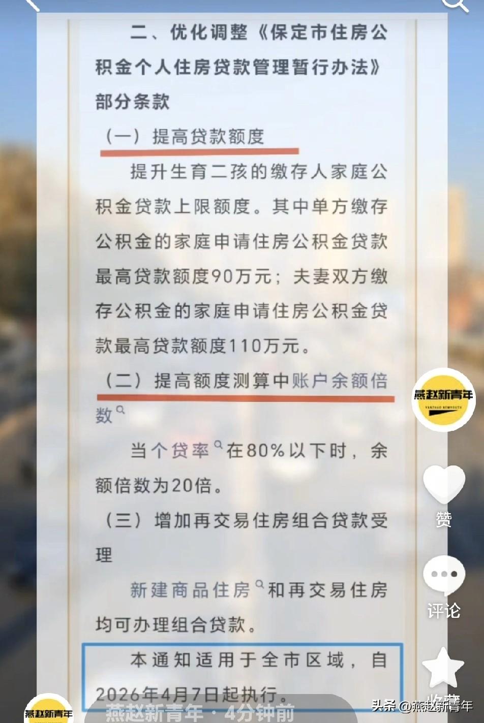 注意了!保定住房公积金贷款有关政策调整,适用于全市区域,自2026年4月7日起执行。