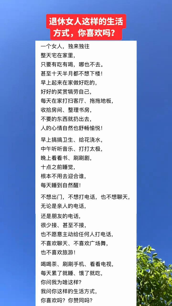退休女人这样的生活方式你喜欢吗? 一个女人独来独往,整天宅在家里,只要有吃有喝哪也不去,甚至十天半月都不想下楼。早上起来在家做好吃的,好好的奖赏犒劳自己,每天在家打扫客厅、拖拖地板,收拾房间、整理书房,不要的东西就扔出去,人的心情自然也舒畅愉悦。 早上搞搞卫生、给花浇水,中午听听音乐、打打太极,晚上看看书、刷刷剧,十点之前睡觉,根本不用去迎合谁,每天睡到自然醒。不想出门,不想打电话,也不想聊天,无论是亲人的电话还是朋友的电话很少接甚至不接,也不愿意主动给任何人打电话,不喜欢聊天、不喜欢广场舞,也不喜欢旅游。 喝喝茶、刷刷手机、看看电视,每天累了就睡、饿了就吃,你问我为什么这样?我问你这样的生活方式你喜欢吗?你赞同吗?