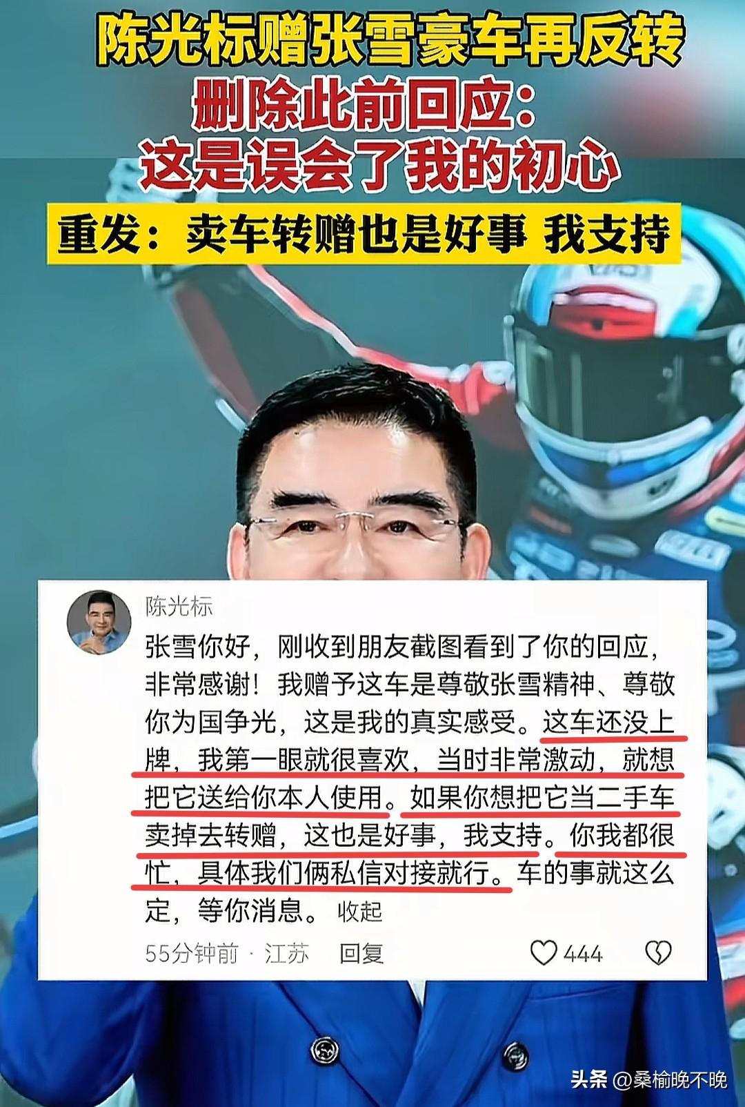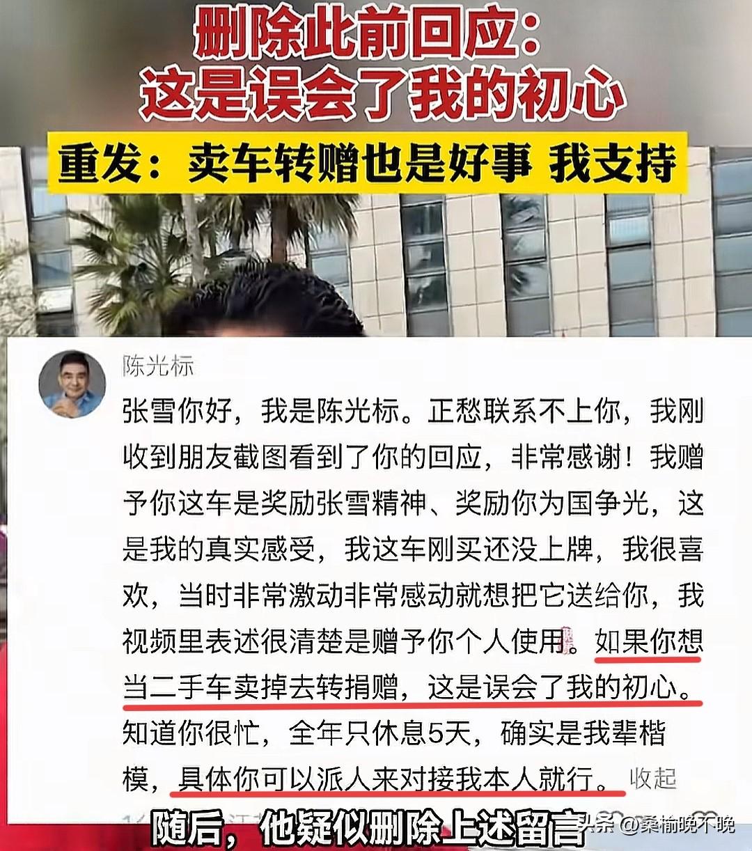 这就有点尴尬了!陈光标这次怎么也没想到张雪一句“你说儿豁”,就要把他赠送的劳斯莱斯拿去卖了,然后果断在张雪社交平台下留言“张雪误会了自己的初心”,并且表示大家都忙,后续的事情私下对接! 陈光标表示这台劳斯莱斯是最新款的,全中国就他这一辆,而且刚买到手,甚至还没有上牌,自己非常喜欢这辆车,但是了解到张雪的精神和为国争光的事迹,心里特别激动,就想把爱车送给张雪使用,但是听到张雪要卖掉这辆车,就觉得张雪误会了自己的初心!但是很快陈光标就删除了这条留言!接着又重新留言表示,如果张雪要卖掉这辆车,自己也支持,具体则是要他们私下对接! 那么大家觉得张雪会私下跟陈光标对接吗?