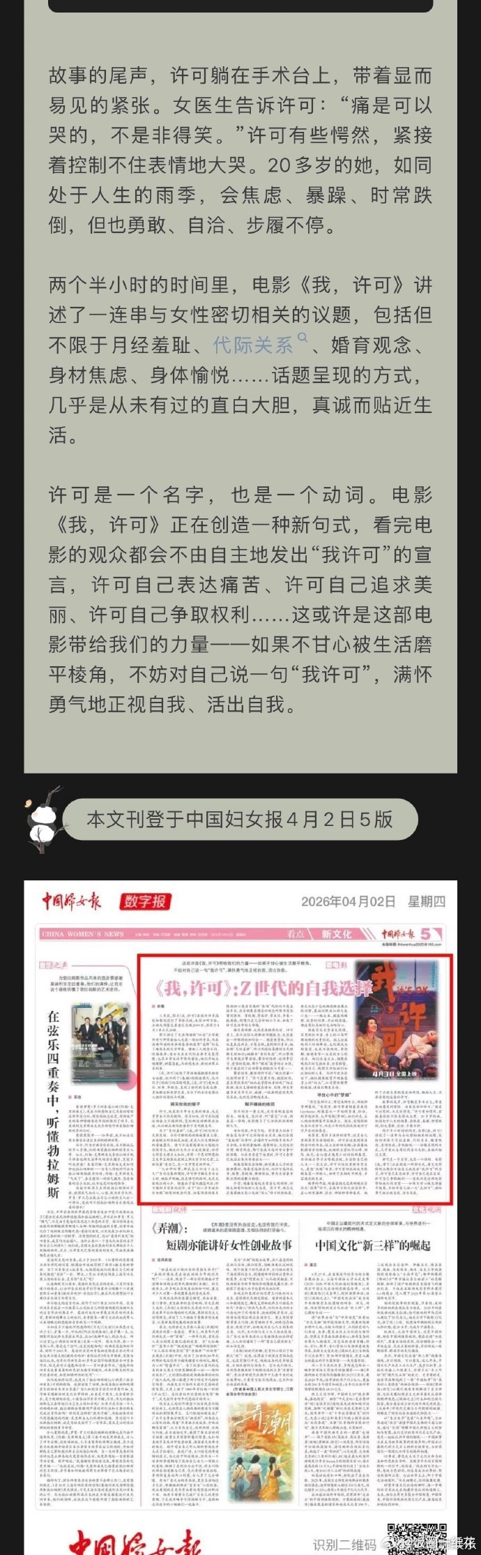 文淇再获主流媒体认可文淇二登中国妇女报,再获主流媒体认可,《中国妇女报》在4月2日的报纸上刊登了电影《我,许可》的相关文章,文中《中国妇女报》认为电影《我,许可》拍出了Z世代的自我选择,电影中的“许可”既是影片中女主角的名姓名,也是贯穿全片的关键词,“许可”所代表的是当下年轻人自我许可的态度。诠释了许可是一个名词也是一个动词 许可是一个名词也是一个动词
