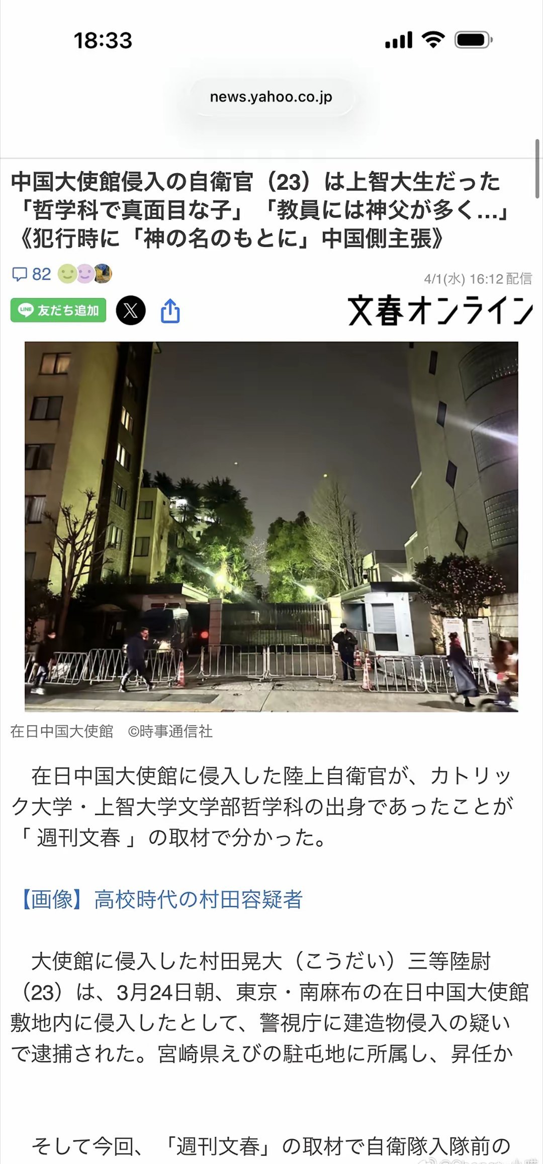 持刀闯馆的日本自卫队员村田晃大一年前毕业于上智大学,是一所天主教为主的大学,他还毕业于哲学系,那里面基本上都是教徒。但是他的同学说他之前从来没有提到过中国,那只能在日本自卫队里面学的。