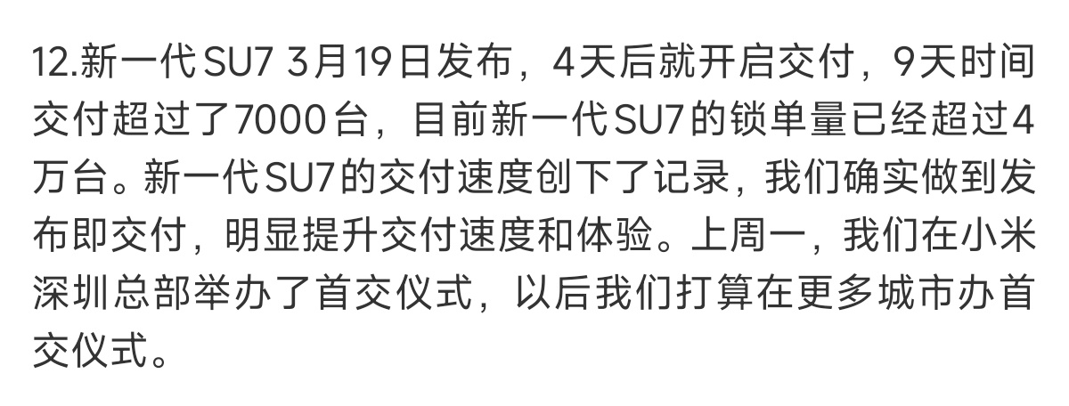 并且在直播的最后环节,雷总也透露新一代SU7锁单超4万辆。距离新一代SU7发布也才短短14天的时间,锁单超过4万辆并且交付在3月份也突破7000辆,这样的数据也证明小米作为车企已经越来越成熟。