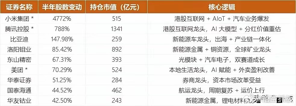 基金持仓市值TOP50,宁德时代、中际旭创、腾讯控股分列前三。截至2026年3月31日,基金持仓千亿级持仓企业市值占ROP50总市值的近60%,分别为:第一位:宁德时代 1906亿第二位:中际旭创 1689亿第三位:腾讯控股 1341亿第四位:新易盛 1326亿第五位:贵州茅台 1255亿第六位:紫金矿业 1124亿第七位:寒武纪 1062亿第八位:阿里巴巴 1026亿第九位:中国平安 1008亿可以看出,AI算力赛道受资本青睐,中际旭创、新易盛、寒武纪等企业稳居基金持仓市值头部。港股互联网企业获基金加仓,腾讯控股、阿里巴巴、美团和小米等互联网巨头出现大幅增持。传统的核心资产遭部分减持,贵州茅台、美的集团等传统的蓝筹股遭小幅减仓。整体来看,基金重仓方向为AI、港股互联网和新能源,传统消费和医药看空。