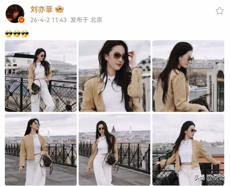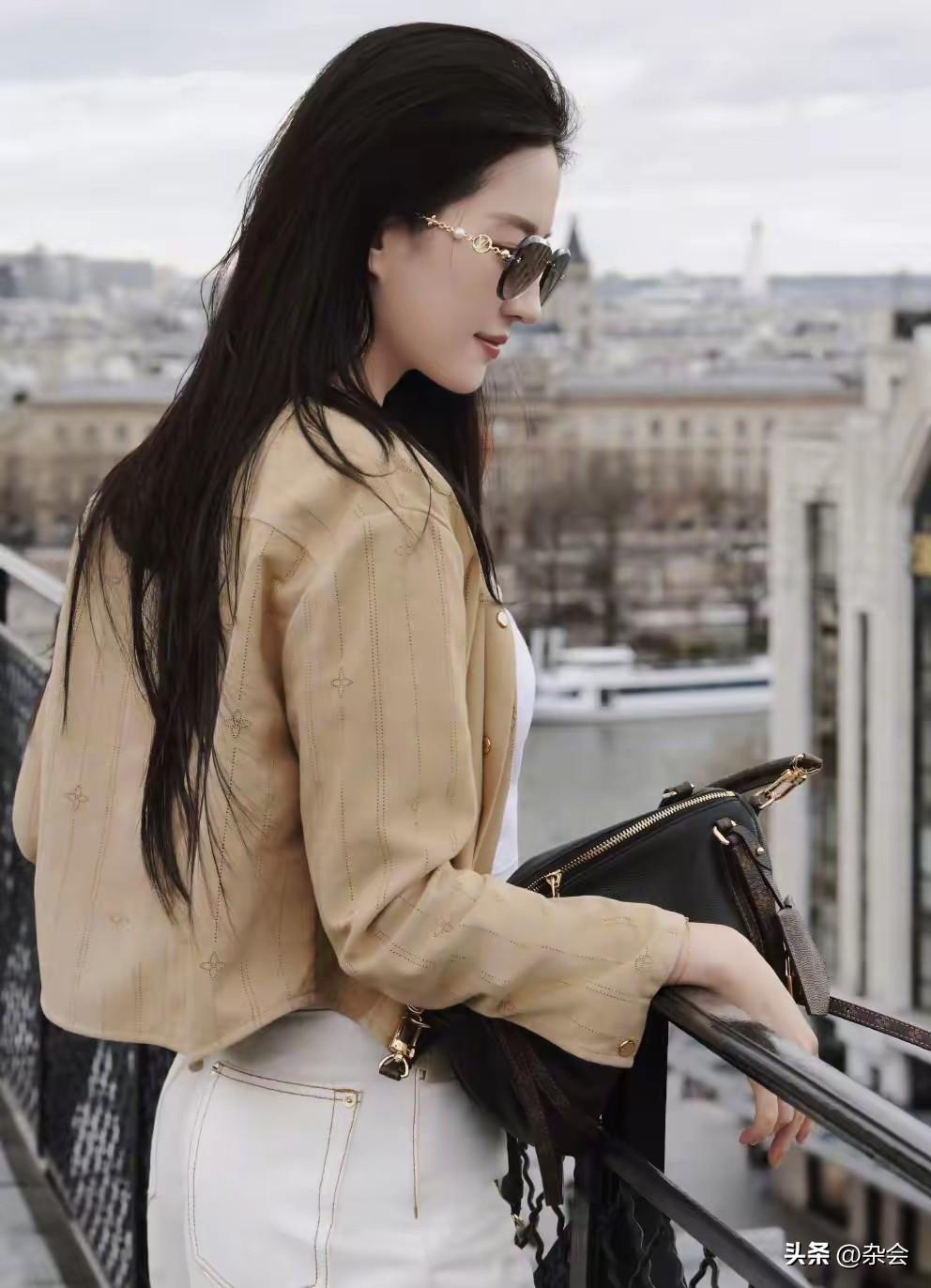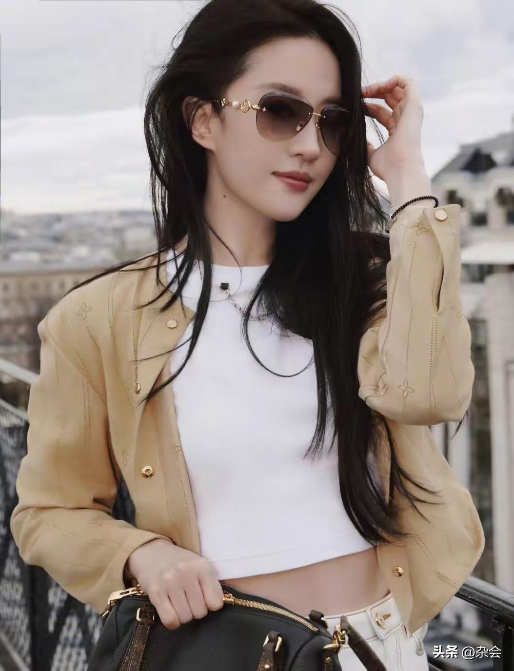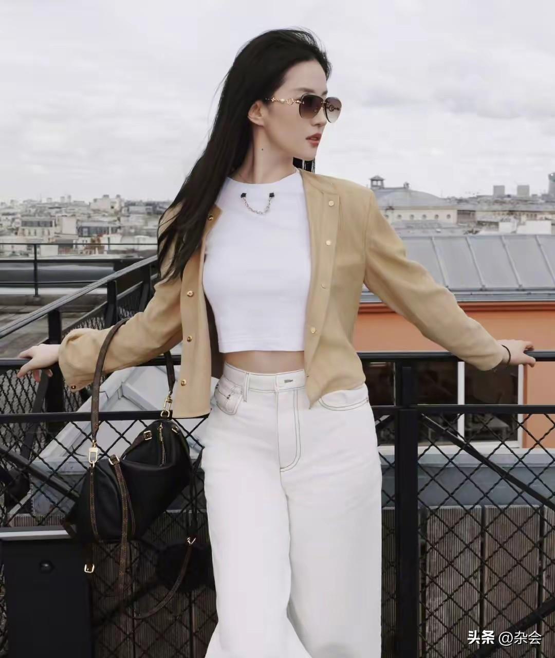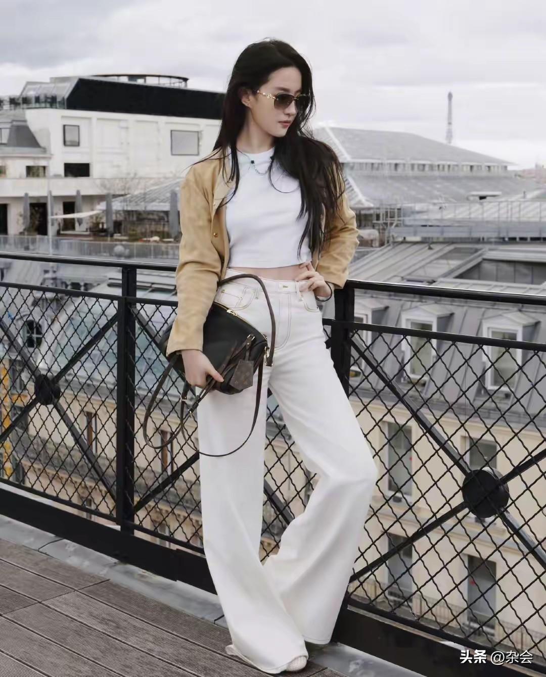 刘亦菲的审美真的从来没让我失望过。 卡其色薄衬衫叠穿白T,配拖地阔腿裤,极简却极