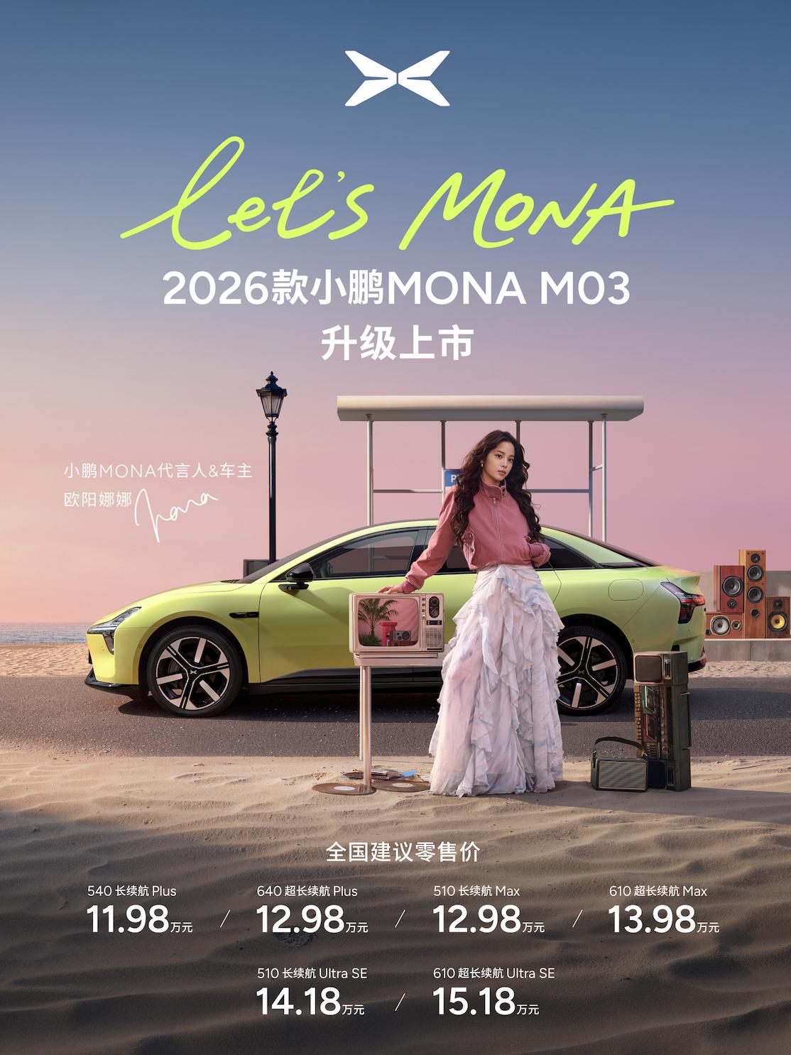 【11.98万起!2026款小鹏MONA M03上市,6款车型+3.5万权益,智驾再下放】4月2日,2026款小鹏MONA M03正式上市。作为小鹏“为年轻人造好车”的战略车型,新车时隔583天迎来首次大升级,在外观、智能、舒适、安全四大维度全面进化,共推出6款版型,官方指导价11.98万-15.18万元,4月30日前下定可享**至高3.5万元上市权益。 新车延续销冠基因,此前已**连续18个月**稳居10-20万纯电轿车销量榜首。此次升级以“20万级标准”打造,新增罗兰紫、牛油果绿车漆与樱珞粉主题套装,座舱大面积软质包覆+仿麂皮材质,质感全面提升。配置上搭载14点云朵按摩座椅、20扬声器1000W音响、双层镀银天幕(紫外线隔绝率99.97%),舒适配置越级。 续航与能耗方面,搭载自研混合碳化硅电驱,CLTC续航最高640km,百公里电耗低至10.8kWh,X-HP3.5热管理系统降低冬季暖风电耗50%。安全上百公里刹停35.63m,全系爆胎稳行,Max版首搭冰雪AES紧急避让。 智能是核心亮点,新车提供双算力智驾版本:Ultra SE版双图灵芯片1500TOPS算力,搭载第二代VLA;Max版单芯片750TOPS,三季度将升级第二代VLA蒸馏版。座舱搭载天玑AIOS 6.0与15.6英寸2.5K屏,配3D车道级导航,科技平权再进一步。 此次焕新,小鹏将高阶智驾下放到12万级市场,进一步巩固A级纯电标杆地位。【来自懂车帝车友圈】
