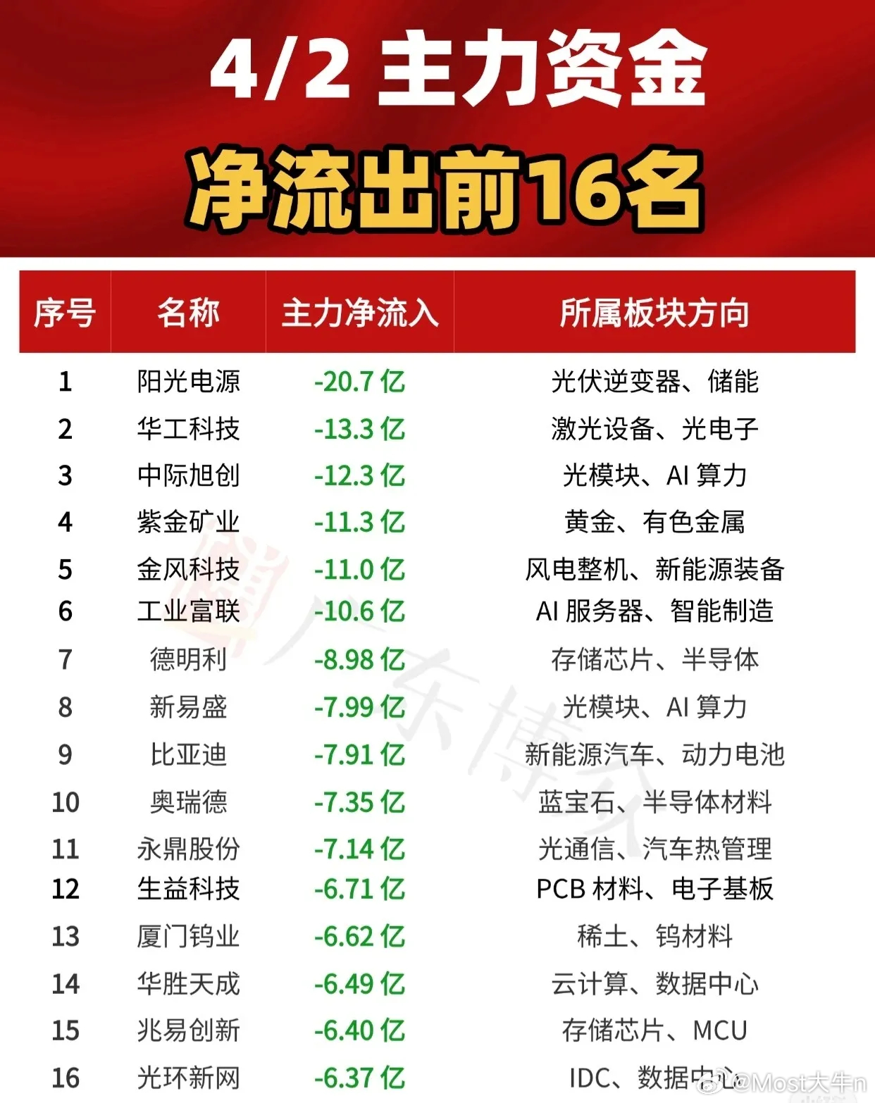 4月2日主力资金净流出前16名(按净流出规模排序)1. 阳光电源(光伏逆变器、储