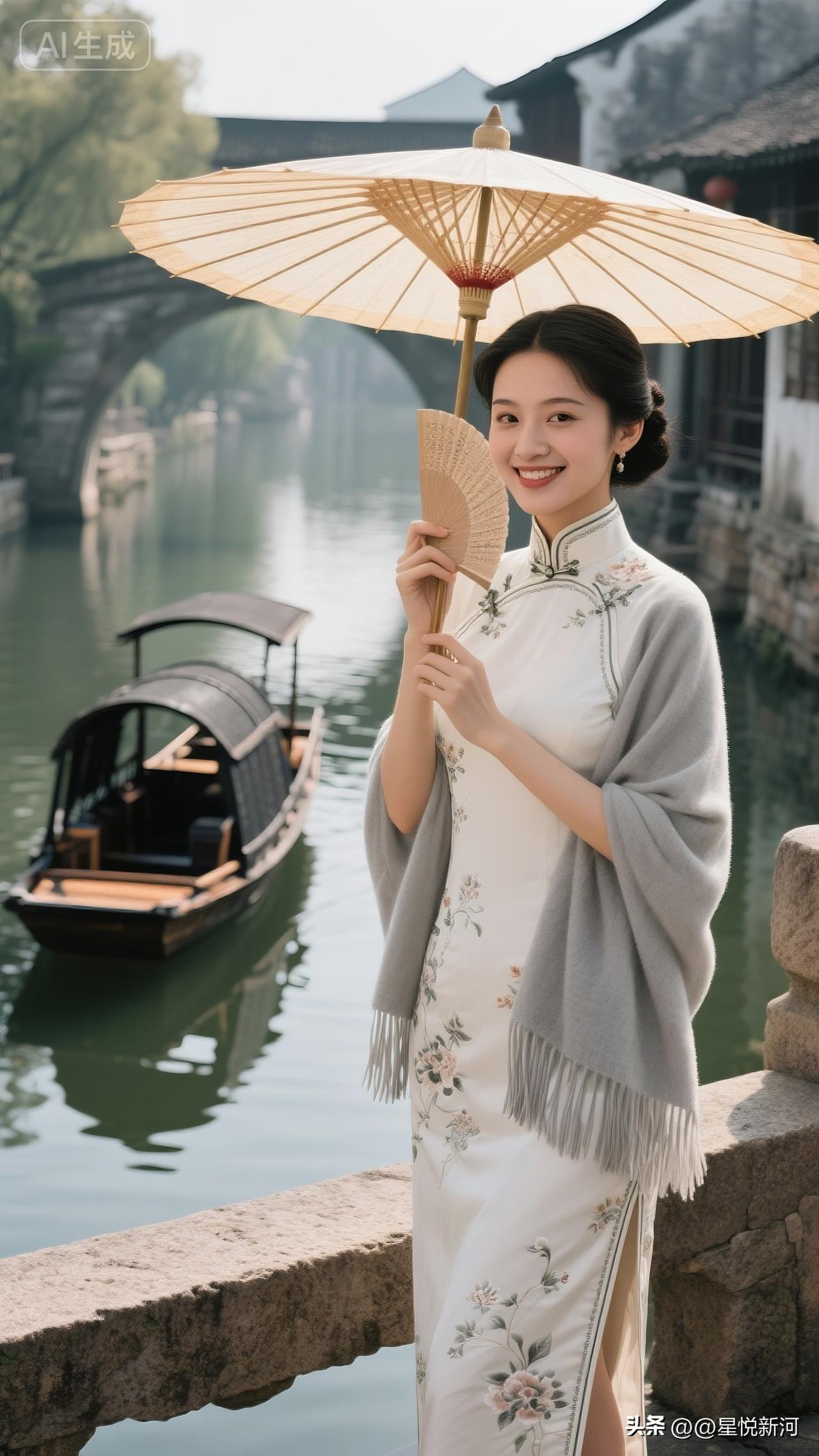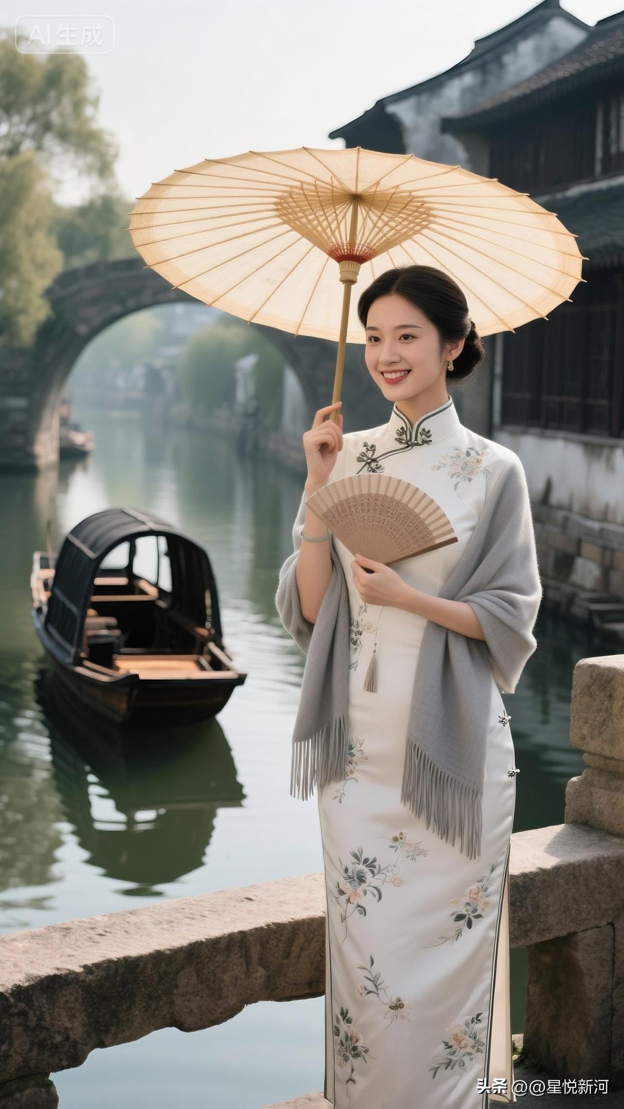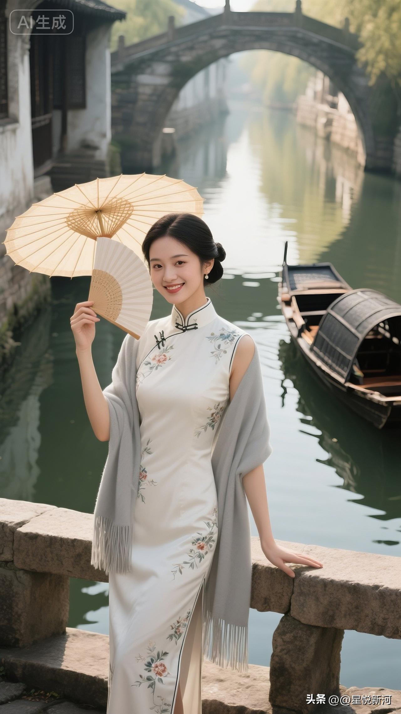 古街,小镇,乌篷船,美女身穿旗袍,优雅,端庄,尽显东方美。