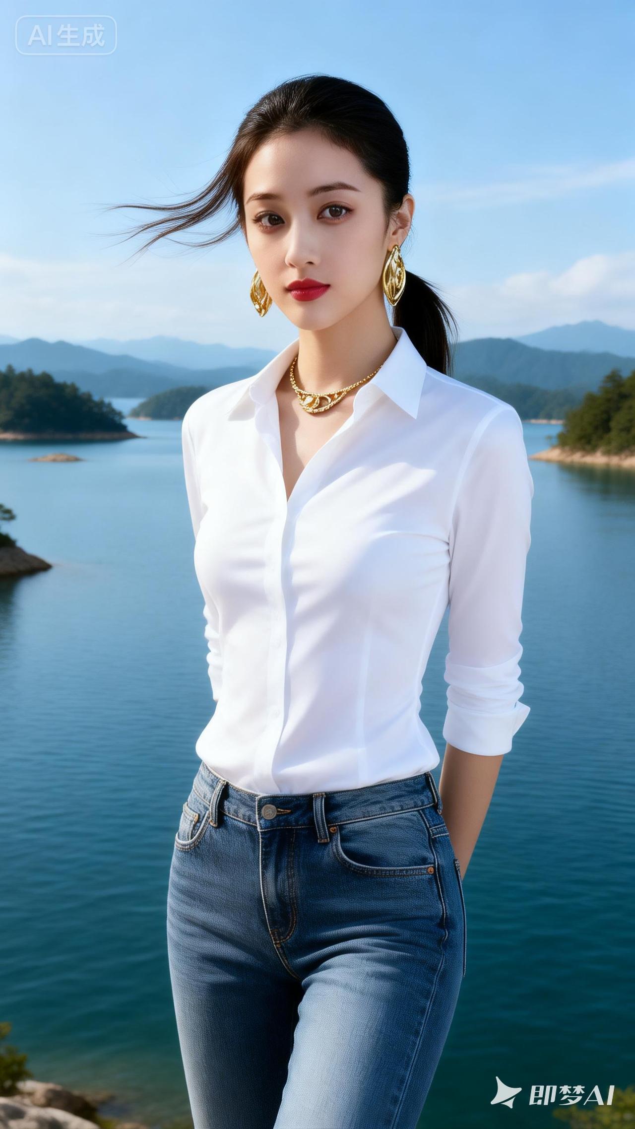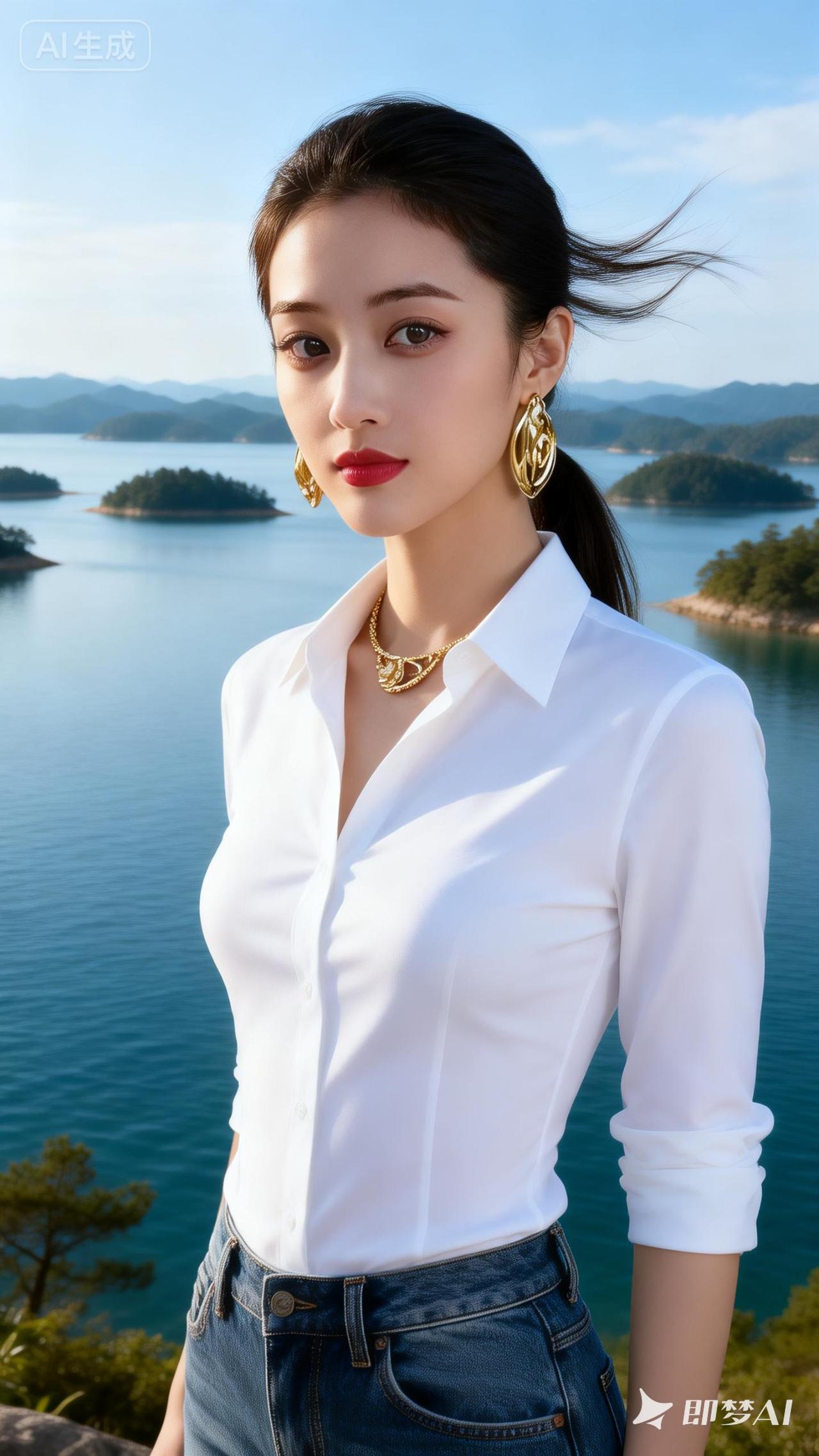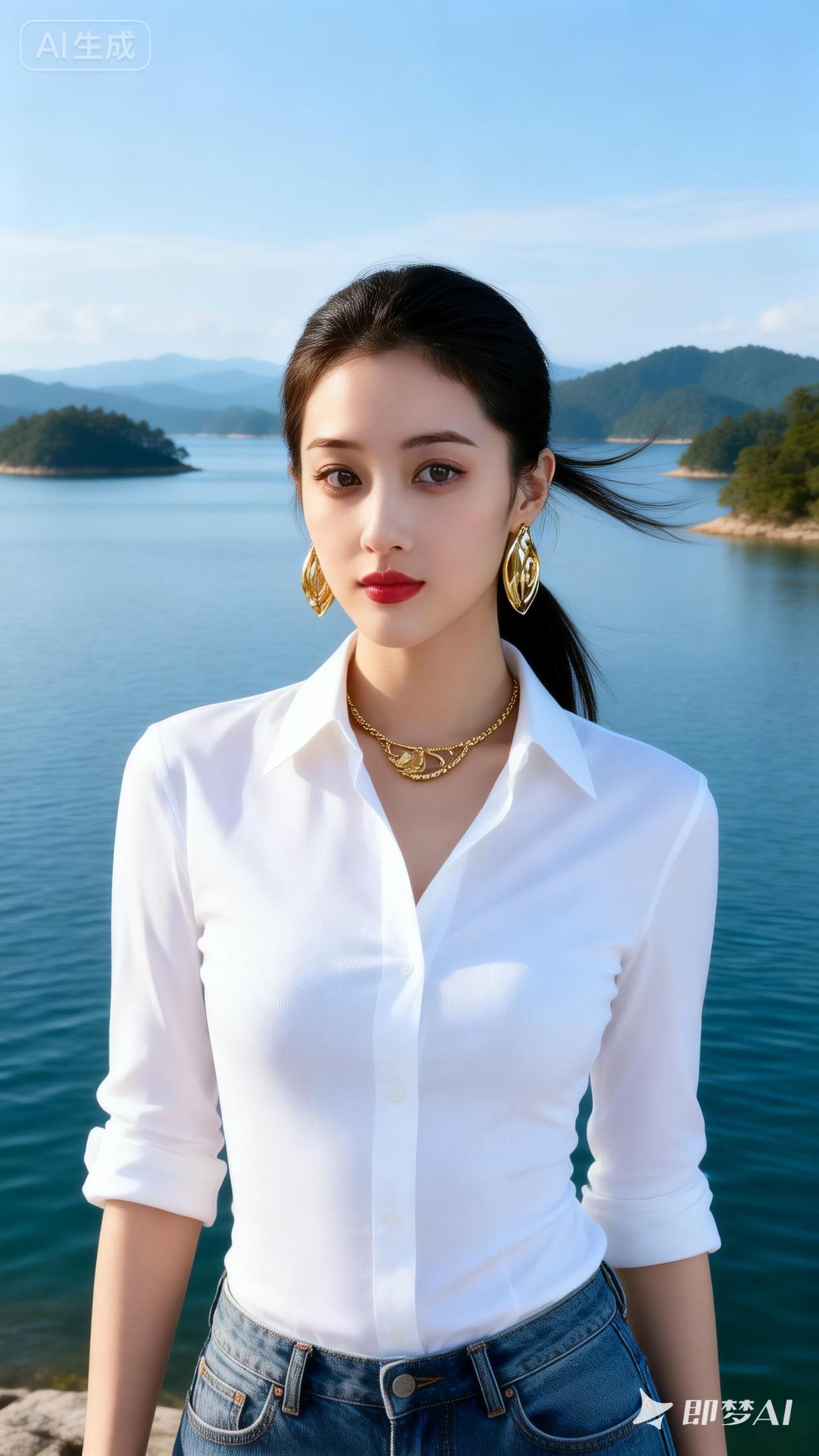 海边少女,白衬衫与金饰的完美搭配,尽显优雅与时尚。