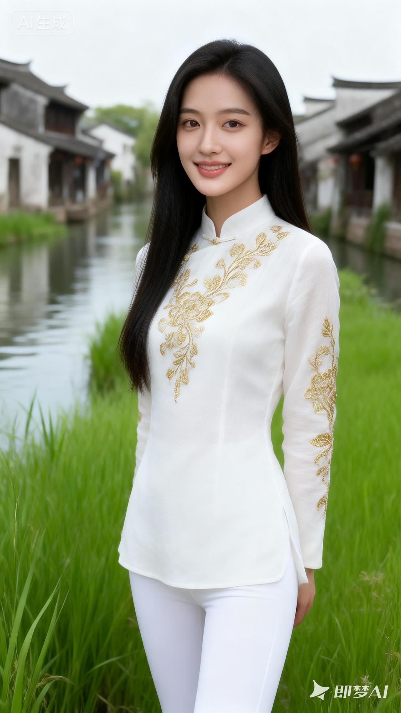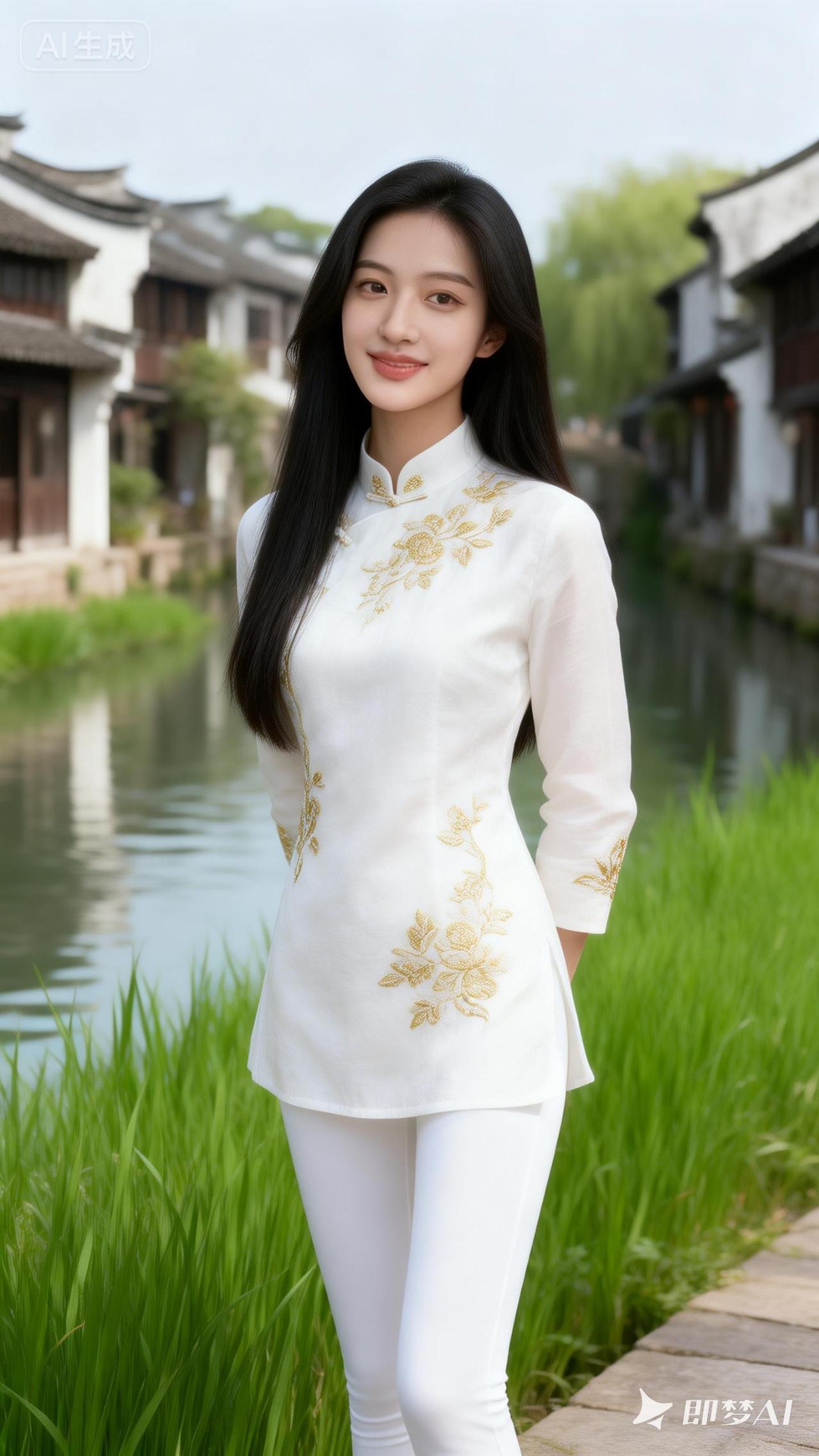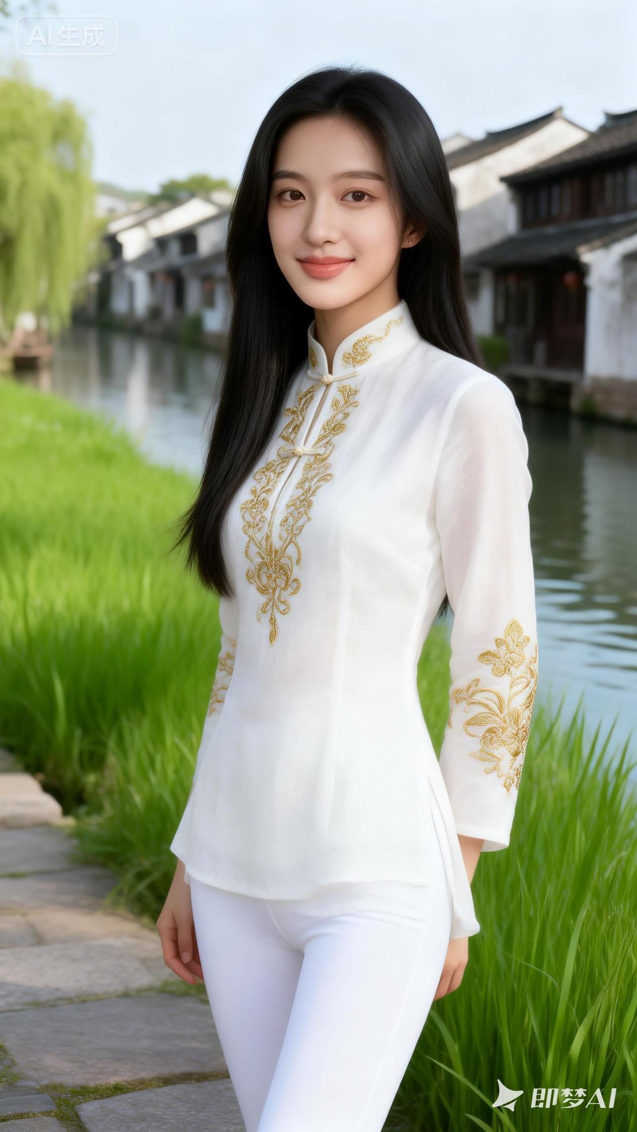 优雅白衣少女,漫步古风水乡,尽显古典韵味。