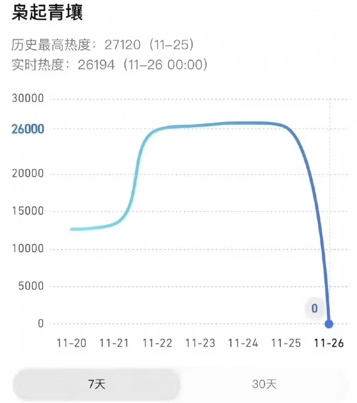 迪丽热巴 古偶利剑玫瑰最高热度27082,枭起青壤最高热度27289,目前白日提灯最高热度27084,热度上了27000就一直疯狂掉,掉的还是很离谱,热度被压到0也不是没干过,鹅这是在催氪吗,白日提灯挺多人在看啊。