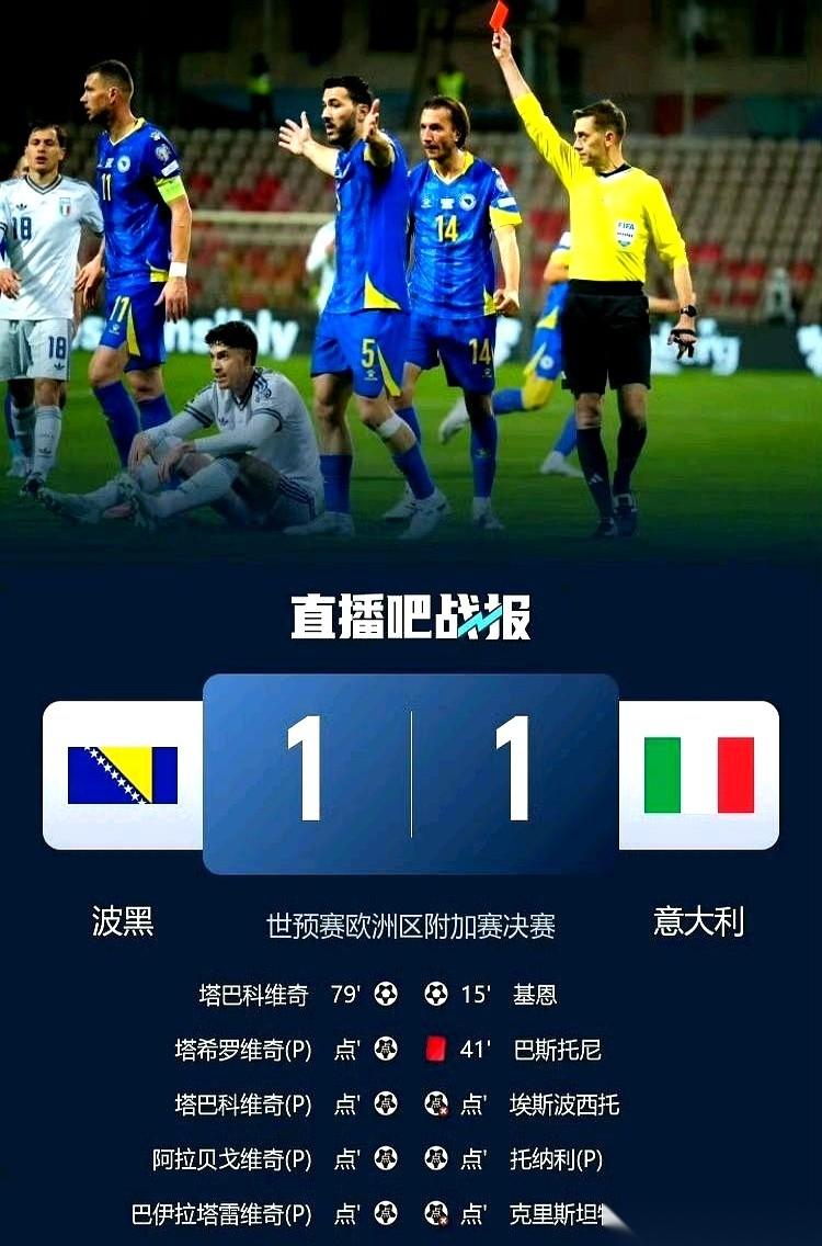 第三次了,意大利,连续三届无缘世界杯。 一声哨响,蓝衣军团轰然倒下。 一切的崩盘,都从上半场第41分钟开始。裁判的手,缓缓伸向后裤兜,掏出来,一张红牌,像刀子一样扎在球场中央。 巴斯托尼甚至没回头争辩,低着头,一个人走下球场,留给队友一个巨大的窟窿。 剩下的时间,就是十个人用身体去填,用人墙去扛。硬生生把比赛拖进了加时,又拖进了残酷的点球大战。 第一个站上十二码的皮奥,一脚,球高高飞向了看台。他扭过头,不敢看自家球门的方向。 紧接着是克里斯坦特,他助跑,起脚,整个球场的人都屏住了呼吸,只听见“哐”的一声闷响,皮球像被一堵墙狠狠弹开,砸在横梁上,那根白色的门框都在抖。 对面,波黑的球员已经疯了一样冲向他们的门将,吼声震天。 这边的意大利球员,一个接一个,瘫倒在了草皮上,双手盖住了脸。 愚人节的清晨,看到这一幕,突然感觉咱们国足,好像也没那么孤单了。