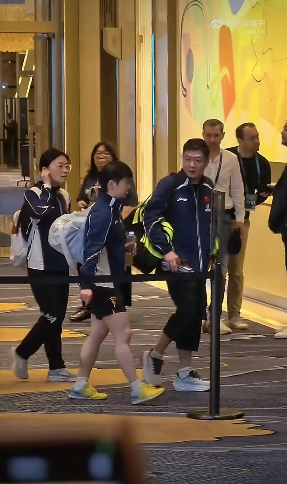 昨晚孙颖莎战胜队友蒯曼后,接下来是小莫的比赛,看台上国乒观赛席上,集中坐在一起观赛的国乒领导和队友们都离开了,只剩邱贻可指导一个人,他是在等莎莎,莎莎收拾完他才起身离开。 体能教练王翔、女队医也在其他地方等着莎莎,四个人汇合后,他们一起走回酒店,莎莎和邱贻可指导走在前面,两人开心地复盘比赛,有说有笑。 看来邱怡可指导最有可能成为洛杉矶奥运周期里莎莎的主管教练,毕竟两人最熟悉。