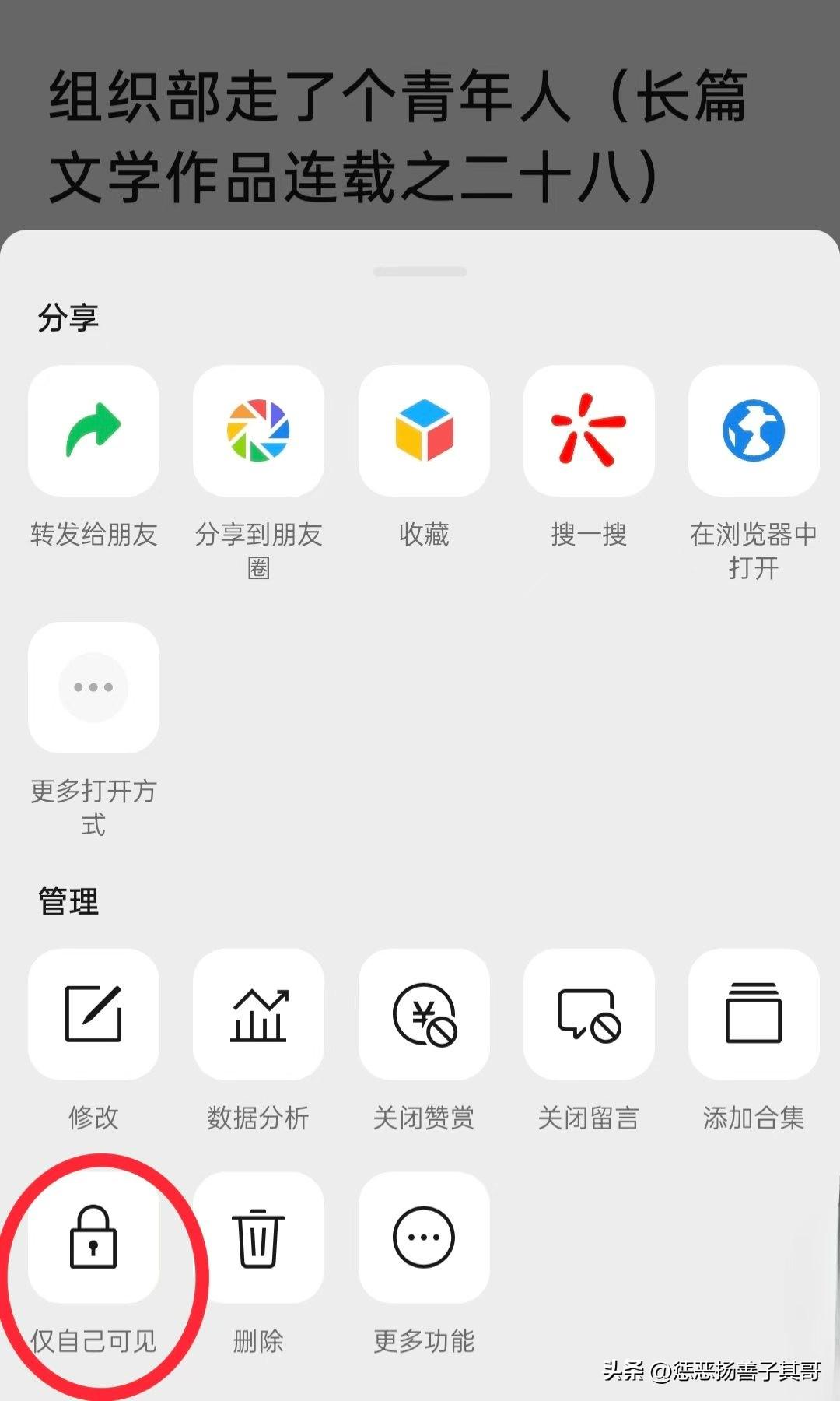 这些年来,自己因为经常撰写现实主义文章,有时会被某些单位的某些负责人视为“负能量”文章,并要求作者予以屏蔽、限流,因为这些单位以及负责人基本都是“好说好商量”,所以在友好“协商”的前提下,作者删除过几篇影响力很大,社会关注度很高的文章。有个别文章因为都是“即兴创作”,所以并未留存备份,删除后就无法恢复,这种情况下,作为作者是很不情愿的,但是,苦于公众号平台文章管理没有“仅自己可见”,只能如此。删除后,如果再写同标题的文章,可能早已经变了味,也寻不到与原文章一模一样的灵感,微信公众号平台文章管理中新增“仅自己可见”一项,很好的解决了作者所面临的这个困惑与难题。同时,在“浏览”页面,也有很多变化,这些无疑都让作者感到温馨,并为其点赞!公众号成长记 公众号新规 公众号创作指南
