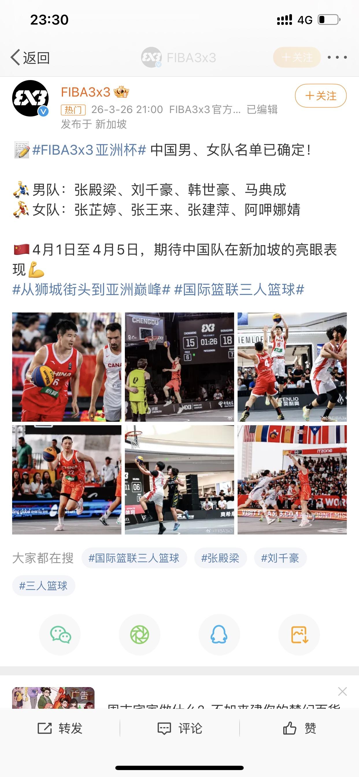 中国三人女篮今日下午进行三篮亚洲杯首战 本次中国三人女篮国家队的队员分别是四川女篮的张王来、陕西女篮的阿呷娜婧、上海女篮的张芷婷、天津女篮张建萍,另外还有两名未公开的随队队员。 FIBA三人篮球亚洲杯 4月1号就已经开幕了,而中国三人女篮国家队因为在亚洲区积分排名很高,所以不用打预赛,直接晋级正赛,因而中国队的赛程安排是今天才开始,第一场就是对阵泰国三人女篮,是今天下午15:50开始。