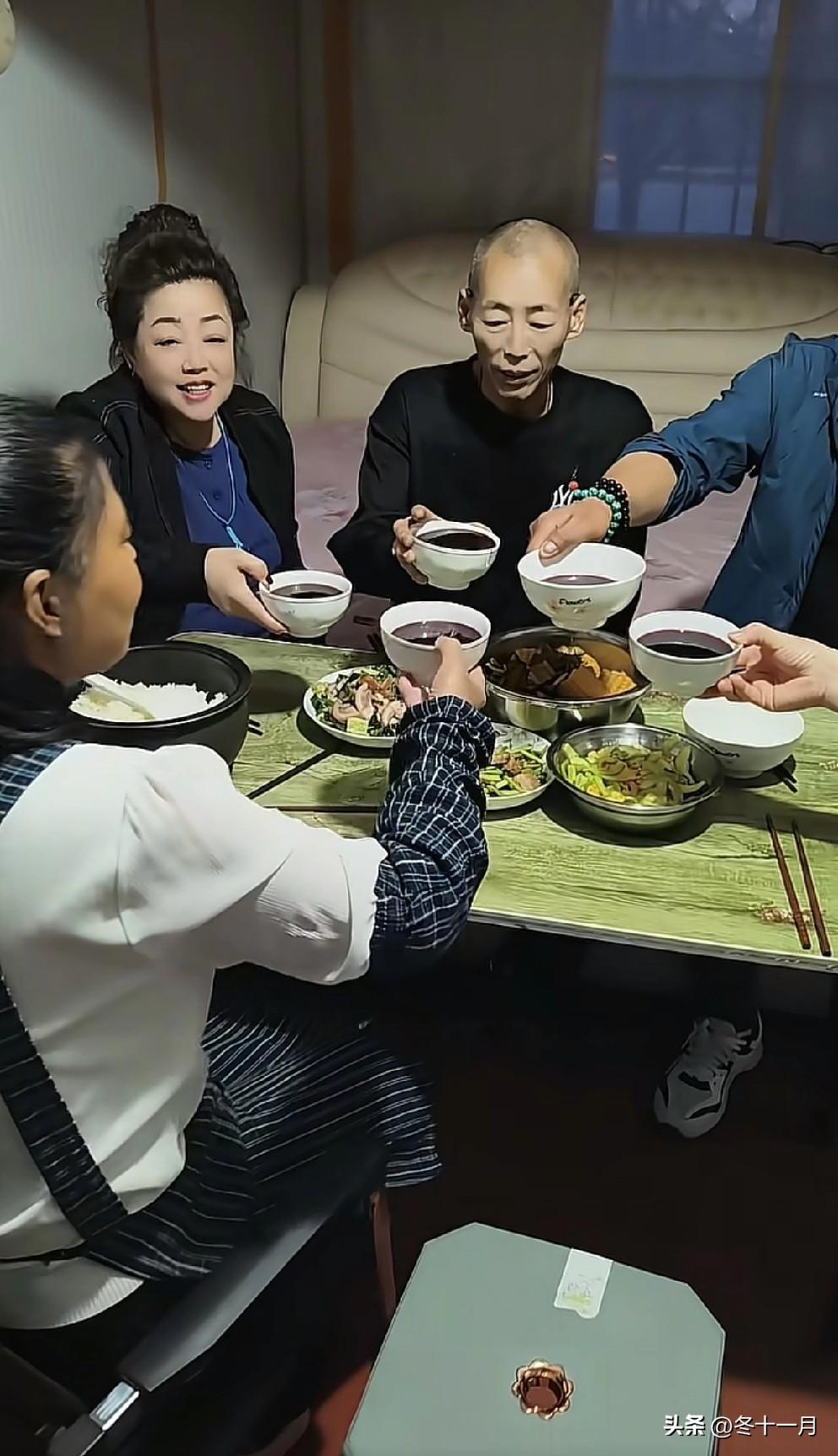 桌上,简单的四个家常菜,亲人们举杯共饮。