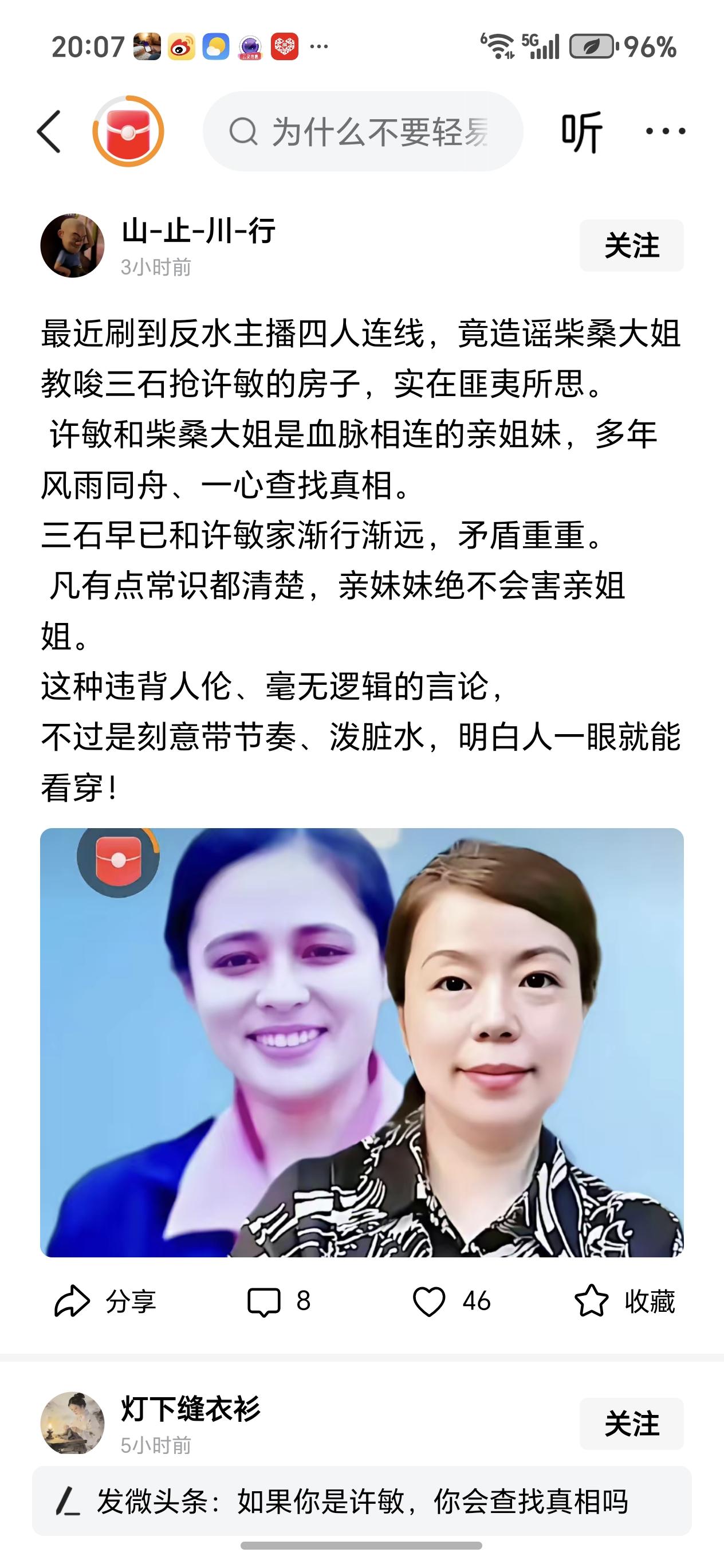 家人们姐姐们早晨好,现在早晨六点,姗姗聊聊这几天乱像,表面上看啊,撕人帮跟恒苏天天在那儿你来我往、争来吵去,搞得好像是在抢流量、争地盘一样。 但你要是从头到尾把这件事捋一遍,就会发现——这根本不是什么内讧,更不是什么个人恩怨。 说白了,他们这出戏,演得太像真的了,可但凡有点判断力的人,都能戳破这层虚伪的幌子。 他们真正的目标,从来不是彼此,而是许敏。 他们做的每一件事,都是在帮杜粉完成那些杜粉自己费尽心思都没做到的事。 什么事呢? 一步步砍掉许敏的左膀右臂,从内部把整个追真阵营搅得稀碎。 你仔细想想,谁被攻击了?谁被孤立了?谁又被逼得退出了? 每一步,都像是提前写好的剧本。 正如昨天柴桑老师说的那句话,我印象特别深: 这场蓄谋已久的恶意围剿,从2024年下半年,就已经露出了苗头。 所以别再被他们带节奏了,别再跟着起哄了。 看清谁是真的在追真,谁是在演戏拆台,这才是我们现在最该做的事。 家人们姐姐们,六年了,小星星眼睛是雪亮的,任你东南西北风,带不偏我们正义守护,许敏姚爸四宝大姐李圣律师加油我们一直都在默默支持你们,相信光明就在眼前。