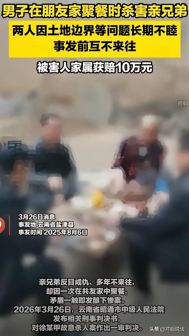亲兄弟酒席反目!弟弟挑衅先动手,哥哥一刀捅穿心脏:半尺地酿成两代悲剧! 云南昭通,一场本该欢声笑语的乡村宴席,瞬间变成了血色修罗场。 2025 年 8 月 6 日晚,村民孙某家中灯火通明,酒香四溢。然而,谁也没想到,这顿普通的晚饭,竟成了徐家两兄弟阴阳两隔的终点站。哥哥徐大,在众目睽睽之下,将尖刀狠狠刺入了亲弟弟徐二的心脏。鲜血喷涌而出,曾经的血脉亲情,在这一刻彻底断裂。 这一切的祸根,并非什么深仇大恨,仅仅是因为半尺宽的土地。 徐大和徐二,本是同根生的亲兄弟。几十年前,两人各自成家立业,本该相互扶持,却因分家时的斤斤计较埋下了仇恨的种子。 “你觉得你占了便宜,我觉得我吃了亏。”这种心态像毒草一样在两人心头疯长。后来分地,两家田地相邻,中间仅隔着一条窄窄的地边。就是这半尺宽的土地,成了压垮兄弟情的最后一根稻草。 徐大坚信弟弟偷偷挖界占了自己的地,徐二则认定哥哥倒打一耙、无理取闹。为了这长不出几斤粮食的半尺地,两家人从口头争吵升级到肢体冲突,打得头破血流是家常便饭。村里干部多次调解,甚至请来了德高望重的长辈,可两人的心结早已死死锁住,谁也解不开。 随着时间推移,土地征收的利益纠葛再次引爆矛盾。从此,兄弟俩形同陌路,路上相遇不仅互不理睬,甚至还要指桑骂槐,恶语相向。三十年的积怨,如同干柴,只待一点火星。 当晚,孙某宴请乡亲,原本只邀请了徐大,刻意避开了徐二,生怕两人碰面生事。谁知人算不如天算,晚上 8 点左右,喝得微醺的徐二路过孙家门口,竟径直闯入了酒席。 冤家路窄,狭路相逢。 酒过三巡,酒精麻痹了理智,却放大了心中的恶魔。徐二借着酒劲,旧事重提,言语间极尽嘲讽与挑衅。“你不是能耐大吗?”“那半尺地你守得住吗?”他不仅毫无兄弟之情,更是率先动手推搡徐大。 这一刻,徐大脑海中那根紧绷了三十年的弦,断了。 多年的屈辱、愤怒在这一瞬间爆发,一个可怕的念头在他脑中疯狂滋长:“杀了他,一了百了!” 徐二仍在喋喋不休地辱骂,甚至再次挥拳。徐大再也无法控制自己,他转身冲向厨房洗菜池,抓起一把锋利的单刃刀,毫不犹豫地回身刺向徐二。 刀锋精准而残忍地扎进了徐二的脖颈和心口。现场瞬间死寂,随即爆发出惊恐的尖叫。徐大仿佛失去了灵魂,机械地将奄奄一息的弟弟拖到门口扔在地上,眼神空洞地站在原地,等待命运的审判。 尽管救护车呼啸而至,但徐二因颈部静脉和心脏破裂,大出血当场离世。那个曾经和他争夺半尺地的亲人,永远地闭上了眼睛。 案发后,徐大的儿子痛哭流涕,变卖家产凑齐了 10 万元赔偿金,承担了所有医疗及丧葬费用,并苦苦哀求取得了死者家属的谅解。徐大在审讯中也供认不讳,辩称是弟弟先行挑衅、动手,自己是一时激愤。 然而,法律是公正且冷酷的。 根据《刑法》第二百三十二条,徐大的行为已构成故意杀人罪。虽然被害人有重大过错(先行挑衅、动手),且被告人家属积极赔偿并取得谅解,这些可以作为量刑时的酌情从轻情节,但绝不能成为杀人的合法理由。 一审法院审理认为,徐二的挑衅行为确实激化了矛盾,对案件发生负有责任,可适当减轻徐大的刑罚。但无论如何减刑,一条人命消逝的背后,是两个家庭的破碎。 这起悲剧令人扼腕叹息。如果当年分地时,兄弟俩能各退一步;如果酒席上,徐二能少说一句风凉话;如果徐大在怒火中烧时,能有一秒钟的冷静……可惜,人生没有如果。 半尺地,值多少钱? 或许连一顿酒钱都不够。 一条命,又值多少钱?再多的赔偿也换不回逝去的生命,换不回完整的家庭。 在农村熟人社会中,邻里纠纷、家族矛盾时有发生。但这起血案警示我们:冲动是魔鬼,忍让是智慧。当仇恨蒙蔽双眼,当酒精催化暴力,付出的代价往往是无法承受之重。 愿逝者安息,愿生者警醒。莫让一时的意气用事,酿成两代人无法弥补的终身遗憾。拼酒致死赔偿 朋友的弟弟去世 发小弑亲灭门案