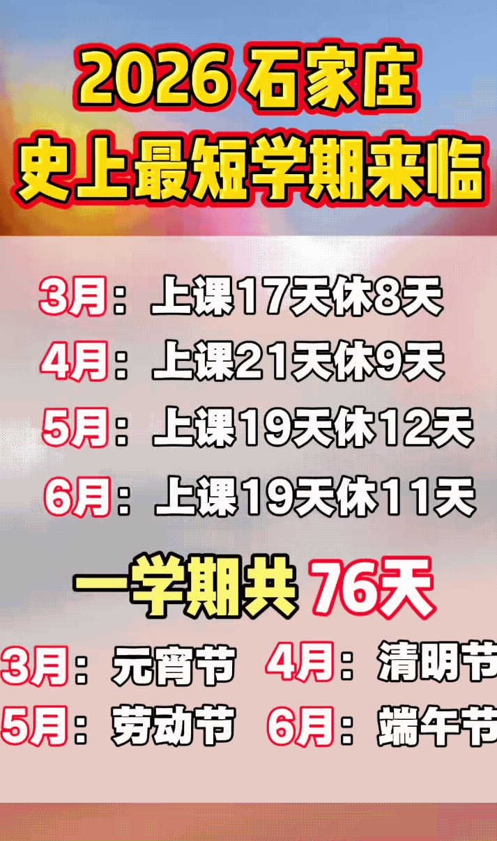 【史上“最短学期”】2026年,石家庄史上最短学期已经过去好多天了!2026年,石家庄要迎来史上最短学期了! 这都怪2025年农历闰六月,让2026年春节大幅延后到2月17日,各地中小学2月下旬甚至更晚才开学,可暑假7月上旬就开始。石家庄义务教育阶段学校2月4日放寒假,高中2月11日放,3月5日才开学。教学周仅18 - 20周,扣掉假期,实际在校也就80 - 90天,短的地方不足80天。 高中生得好好应对,聚焦目标,像数学函数、物理力学这些重点得梳理好,制定计划精准发力,不然这学期眨眼就过去了。 信息图片来源网络侵权联删
