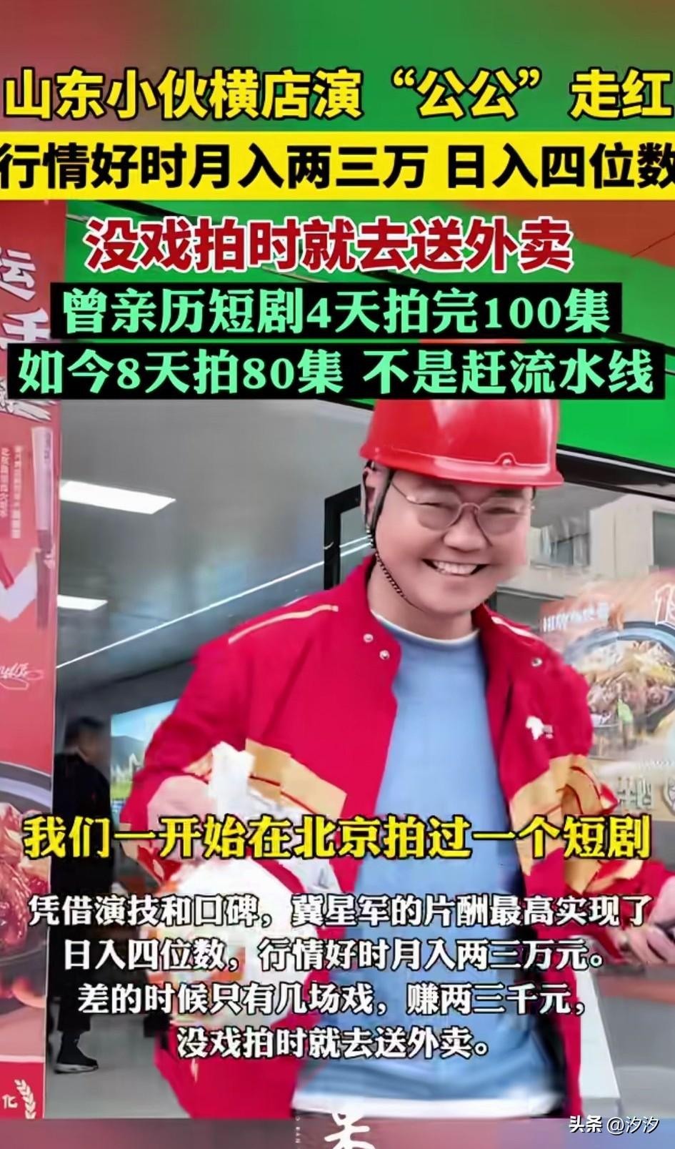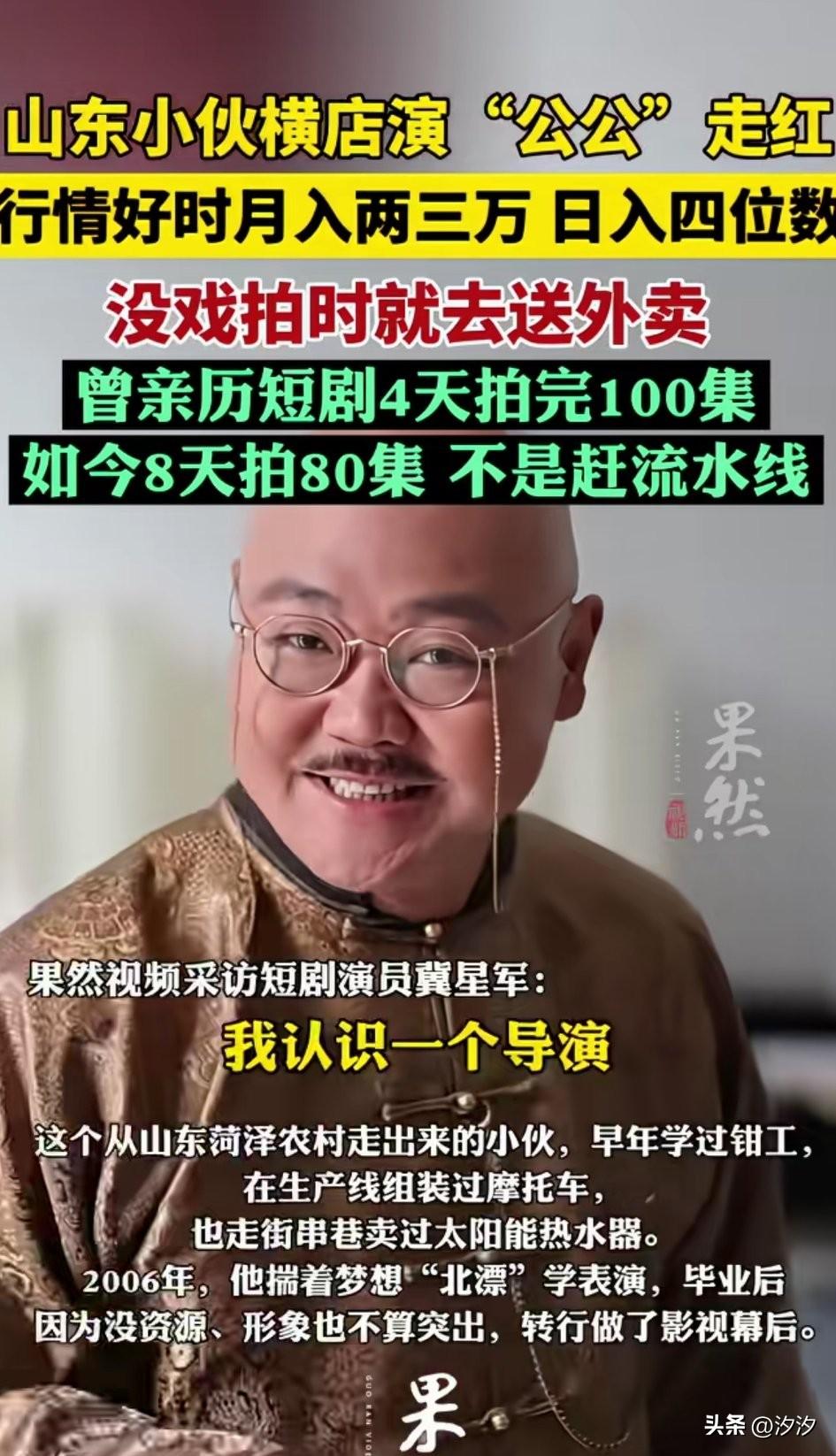 山东小伙,横店也公公火了, 他自己也没有想到自己会火, 当时只是去客串了一下角色, 没有想到会出名, 有时候四天拍100集, 他当时怀着北漂的梦想学了表演, 毕业后没有资源, 只能来跑龙套了, 因为认识一个副导演, 混的也还算可以, 忙的时候一个月两三万, 忙的时候两三千, 没有戏拍的时候就去送外卖, 如今可拍的戏越来越少了, 不过每场戏他都很认真, 他演的公公特别出名, 他也没有想到会因为客串公公的角色出名,大家觉得像他这样的龙套值得去跑吗? 横店全名片场 横店阳光选角 横店临时导演 最火的公公 横店男模