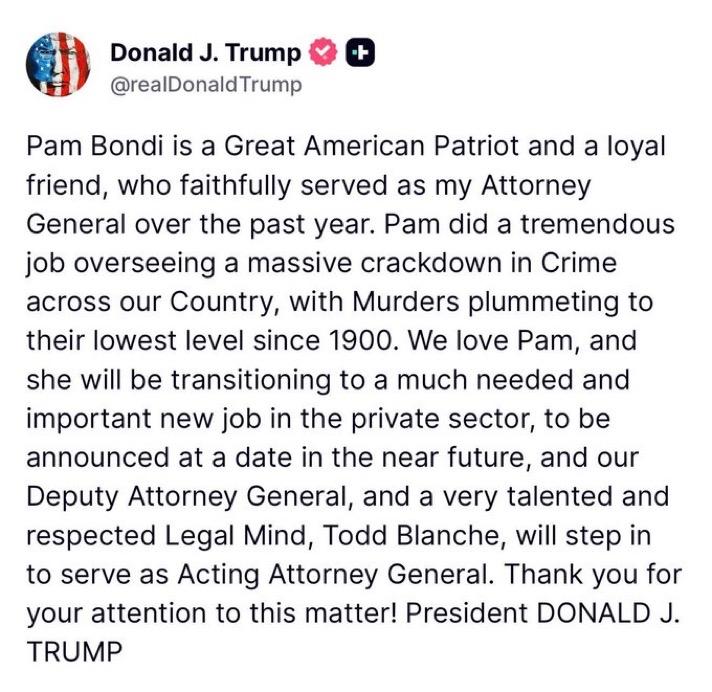 特朗普在真相社交宣布帕姆·邦迪不再担任司法部长。 他说,在她出色地完成了监督全国打击犯罪的工作后,她将转入私营部门。 “我们爱帕姆,”特朗普说,并补充说,托德·布兰奇是一位“非常有才华且受人尊敬的法律专家”,他将担任代理司法部长。 特朗普的前封口费律师托德·布兰奇现在负责爱泼斯坦文件的公开工作
