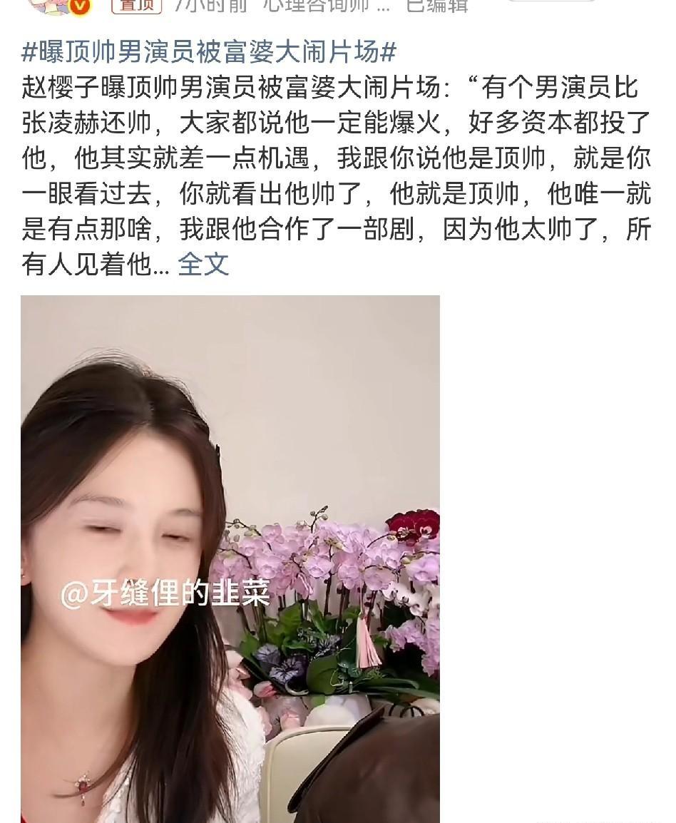 4月2日,赵樱子直播带货时突然放料,称合作过一位“顶帅”男演员,引发全网吃瓜。 男主关键特征(赵樱子口述) 颜值:比张凌赫还帅,一眼惊艳型,帅而不自知 身高:比张凌赫略矮一点 资源:资本力捧、资源拉满,就差爆红机遇 性格:异性缘爆炸,剧组从女主到群演都主动搭话;偏爱富婆款,对普通女演员没兴趣 事件:片场跟女演员聊天,被长期包养他的富婆撞见 场面:富婆冲剧组喊“别拍了!出来!”,叫停拍摄、当众发飙、强行把人带走 全网猜是谁?(热门人选) 1. 宋威龙- 浓颜系大帅哥,符合“顶帅” 资源好、资本力捧但一直差口气 跟赵樱子合作过《彼岸花》 2. 成毅- 古装顶颜,资本力捧 与赵樱子多次合作(《琉璃》《长安诺》) 赵樱子曾自曝对他“因戏生情” 3. 刘学义- 公认古装美男 合作《琉璃》,赵樱子也提过他 4. 许凯- 颜值能打,资源好但爆火度不及预期 网友提名“差机遇”代表 可信度争议 无实锤:全程口述,没照片、没视频、没剧组佐证 赵樱子“前科”:- 曾说刘学义暗恋她、对成毅因戏生情 自曝怀孕、恋上陈晓13年,多次前后矛盾 每次爆料都不点名、留悬念,最后导向直播带货 网友辣评 “递刀式爆料:不说名字,全靠脑补” “富婆三年砸几百万,把他当电子宠物监控” “这哪是道歉,这是给自己焊道德金身”(你原文那味儿)