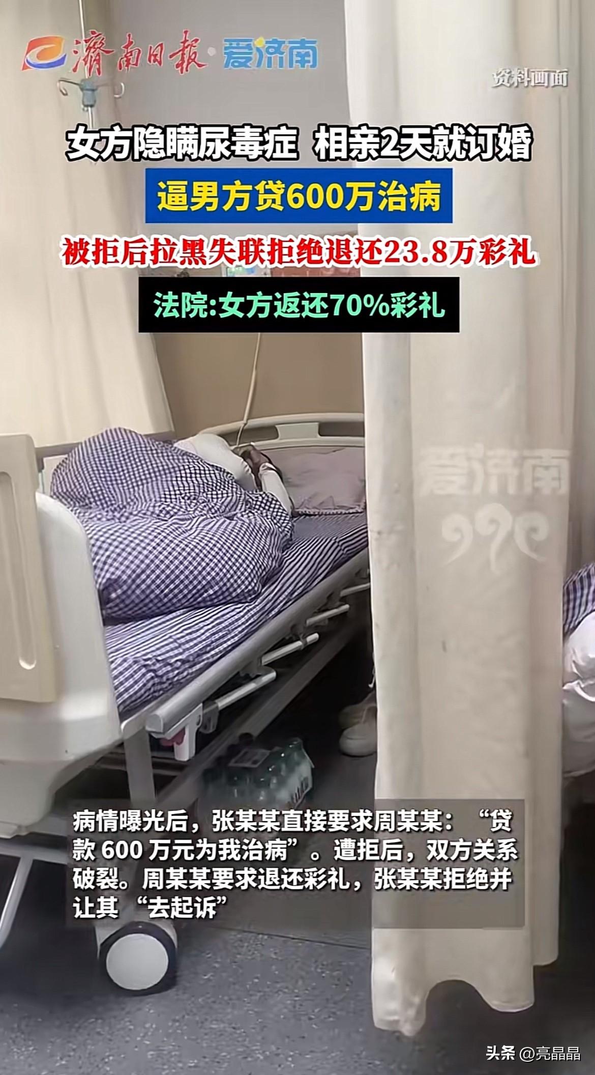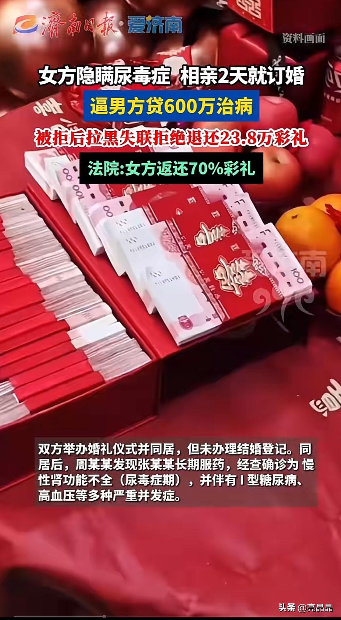 河南周口,一男子花23.8万彩礼,娶相亲认识2天的相亲对象,婚后发现妻子患有尿毒症,妻子竟要求他贷款600万给她治病,男子拒绝后被拉黑,无奈起诉要求退还彩礼,没想到法院只判还70%彩礼。 2025年1月,男子经媒人介绍认识了该女子,两人见面相谈甚欢,互生好感。 两人也老大不小了,家里催得急,所以在见面2天后,他们举办了订婚仪式。 男子订婚宴下聘:18.8万彩礼、5万车款和三金,共计23.8万元,这钱包含了父母和自己奋斗攒下的辛苦钱,还借了别人的钱,本以为花的值了! 没多久两人就举办了婚礼,女子就搬进男方家同居,只是未领结婚证,刚开始两人很是甜蜜。 男子发现妻子经常无精打采,脸色苍白,还背着他长期服用药物,一查才发现妻子患有尿毒症、糖尿病等重大疾病。 男子感觉自己被骗婚了,找妻子理论,没想到妻子竟要求他贷款600万给她治病。他就是普通打工人,哪能负担起600万这样的天文数字? 4月21日男子果断拒绝贷款给她治病的要求,找妻子协商退彩礼一事,妻子拒绝。 第二天妻子病发住进医院,之后态度大变,直接拉黑男子,退彩礼一事没想到妻子理直气壮让他去起诉。 无奈男子只能以妻子婚前隐瞒重大疾病告上法庭,要求退回23.8万彩礼。 法院考虑女子确实隐瞒重大疾病存在过错,综合考虑共同生活,双方均有过错,最终判决女子返还70%彩礼。 这一判决炸开了锅,引发婚恋市场的诚信讨论。 “女子明显是婚前隐瞒重大疾病,存在过错,为什么只能退70%彩礼,而不是全额返还?” “这会知道婚前体验的重要性了吧?婚检是对自己的保护,别怕影响感情。” “男子也是傻,认识两天就闪婚,女子的健康状态、家庭信息都没了解清楚就敢结婚,就是自讨苦吃。” “媒人太没职业道德了,为了媒人钱,昧良心介绍这样有重病的人给男子,太坏了,应该也要追究媒人的责任。” “女子利用男子的信任,隐瞒自己患病事实,想想找男人当冤大头,找人赚钱给她治病,利用婚姻来谋私利,太坏了。” 婚恋本该建立在真诚和信任之上,女子婚前隐瞒健康状况,婚后要求男子贷款给她治病,这如意算盘打得太响,换哪个男人都不能接受。 女子的隐瞒和索取,是对婚姻诚信的严重践踏,婚姻不是一场交易,也不是用来谋取钱财的工具。 这事给广大未婚青年敲醒警钟,婚前一定要做婚检,了解对方的健康状况,家庭信息是对自己和未来婚姻的保障,多一分谨慎,多一分安心。 对此事你怎么看?欢迎评论区留言。